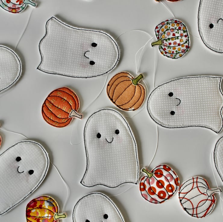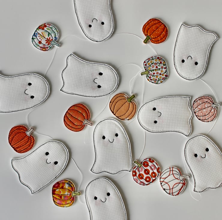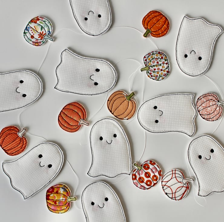 Each of the ten pumpkins and nine ghosts suspended along this garland, are sewn using cotton cloth, 100% wool felt and free hand machine embroidery; multiple layers of cloth are sewn together and cut out by hand using very sharp scissors.
