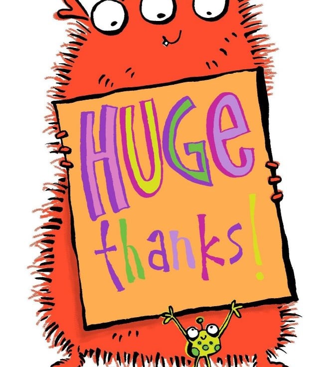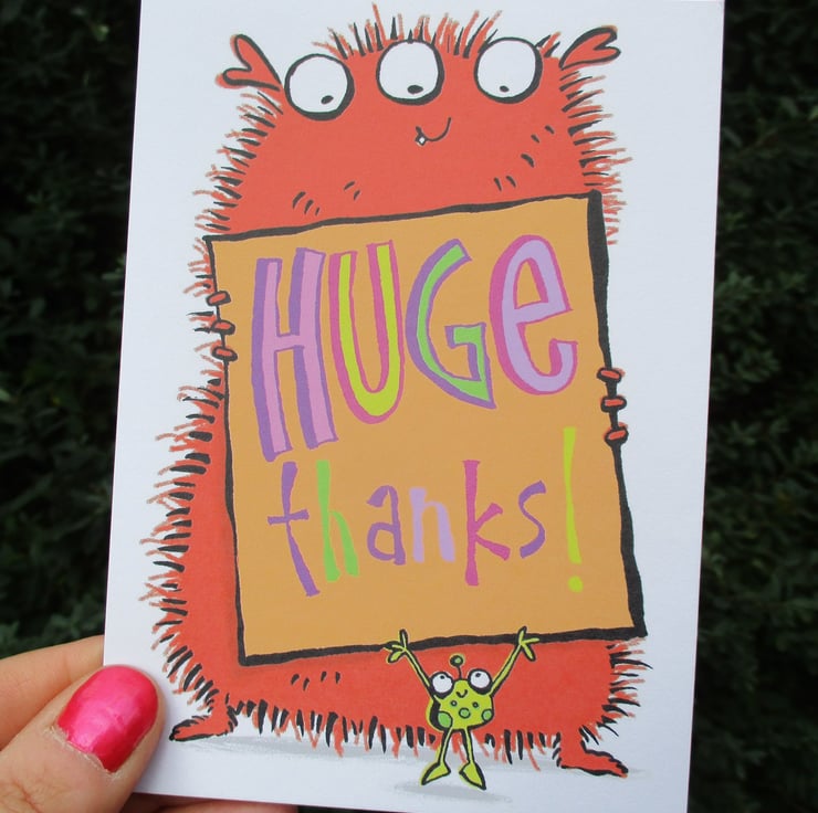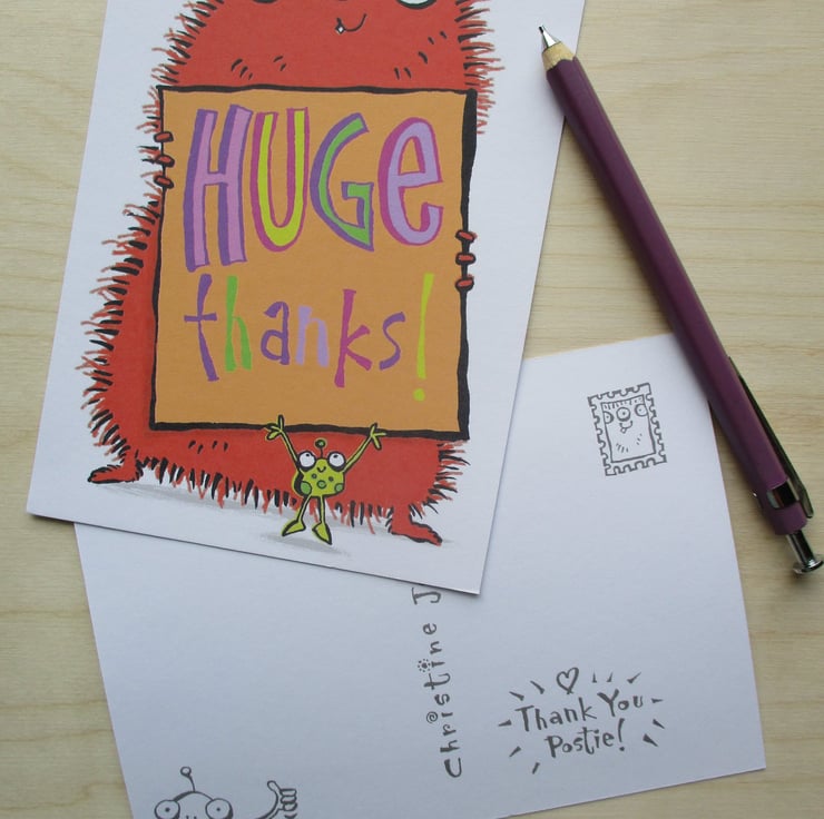 With a design taken from an original illustration, this thank you postcard features a giant fluffy orange monster and his wee green pal offering a humongous thank you!
