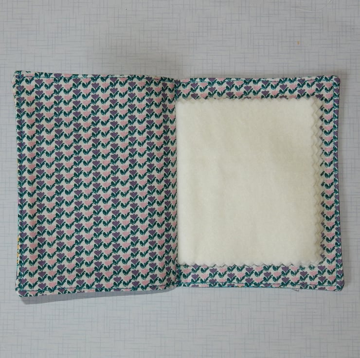 This is a very pretty needle case, made from cotton fabric with a turquoise, pink and yellow pattern. Useful items should be pretty too! It measures approx. 4.5 x 3 inches and is is lined in toning floral cotton fabric and has four felt leaves for your pins and needles.