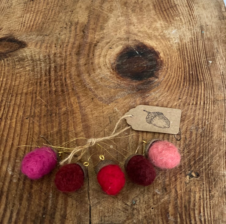 A set of five assorted hand made acorns in shades of pink to deep red.