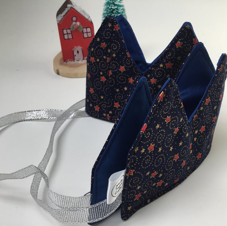 If you're trying to live more sustainably, little changes can make all the difference. These lovely crowns are made from gorgeous Christmassy cotton fabric which comes in four different colour ways. They are strengthened with a soft interfacing and lined with plain polyester cotton. They tie on with coordinating lengths of ribbon and will fit a range of head sizes. Alternatively we can join the crowns with a length of soft, coloured elastic. Please choose your preferred option.