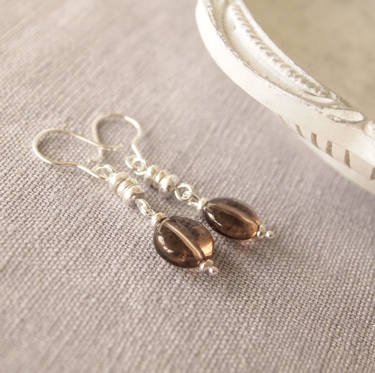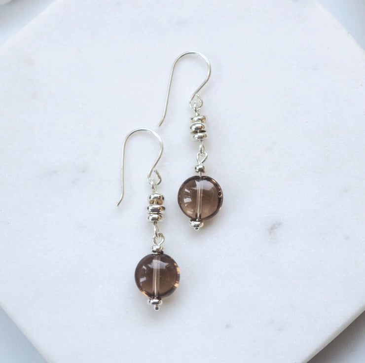 Simple and elegant silver and Smoky Quartz Drop Earrings. A modern classic design with handmade silver beads and a round puffed coin smoky quartz drop. These earrings are also eco-friendly, using wires made from recycled metal and hand-made small silver molten beads that I make in my studio with Silver scraps from other projects. The beads are also vintage, from my large collection which I've sourced over many years