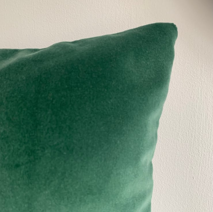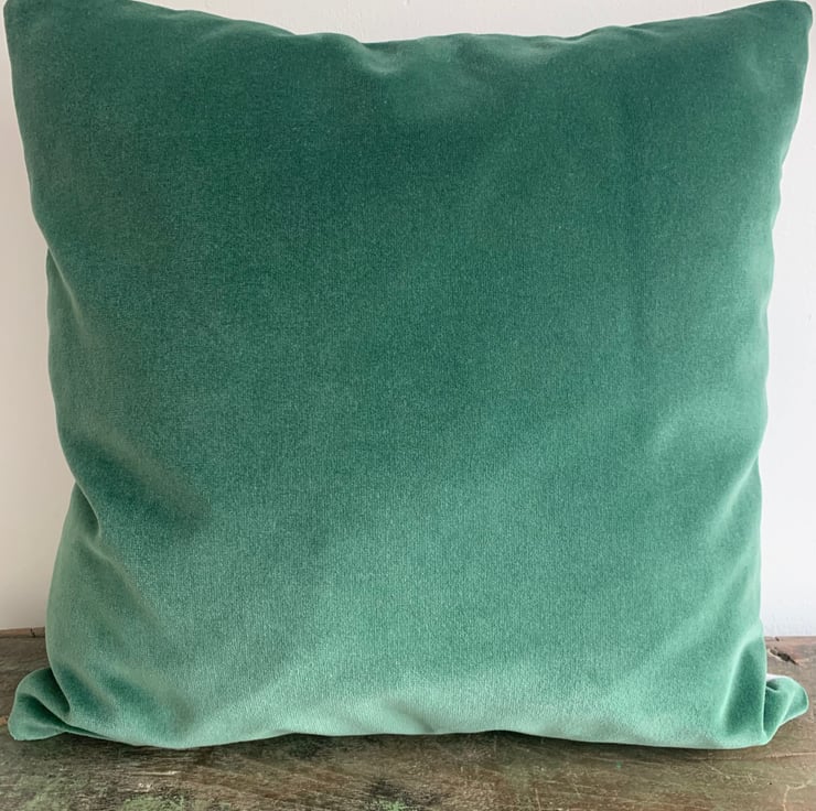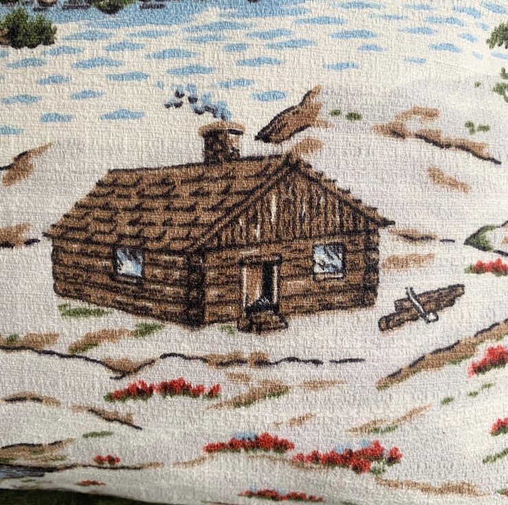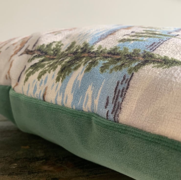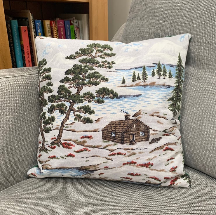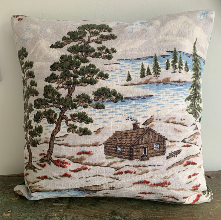 Cute cushion made from reclaimed vintage barkcloth with a snowy alpine scene. The cover is backed with soft green velvet and it fastens with a zip in the bottom seam.
