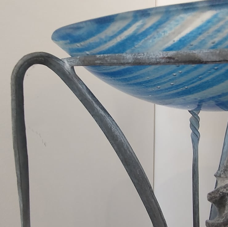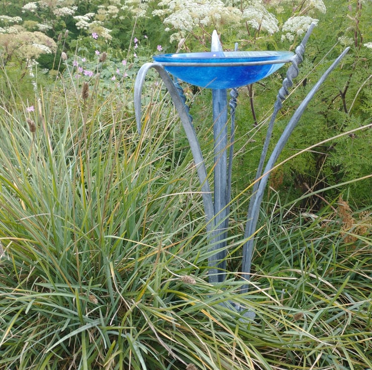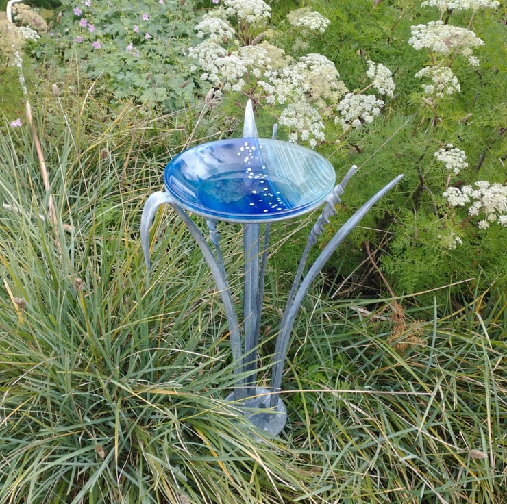 The Baby Bullrush bird bath is the smaller of our bird baths designed on this theme. It is a quality artisan galvanised steel stand combined with a beautiful fused glass bowl.