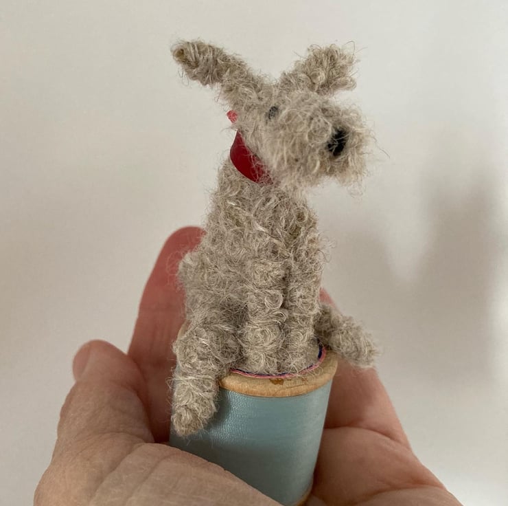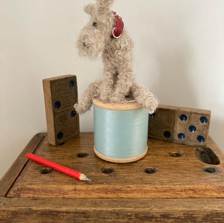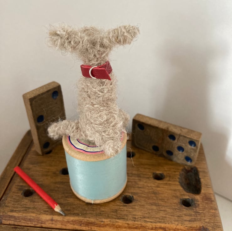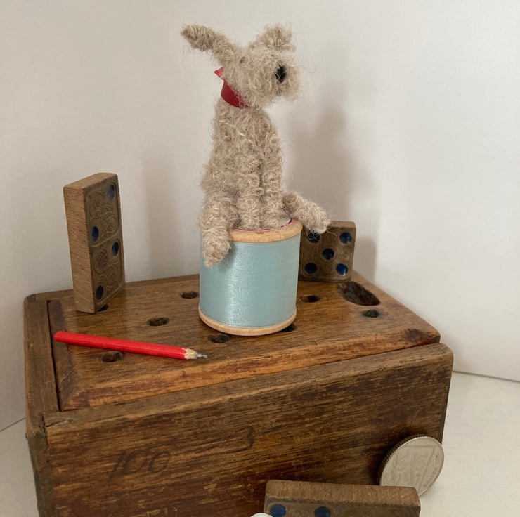 Scamp sits on top of a vintage wooden cotton reel and measures approximately 4” high. His body is sculpted from wire and then he is wrapped in mohair wool. Each animal I make is a “one of a kind” and has it’s own personality. All my animals come boxed and will be carefully wrapped. I post by Royal Mail using second class signed for postage.