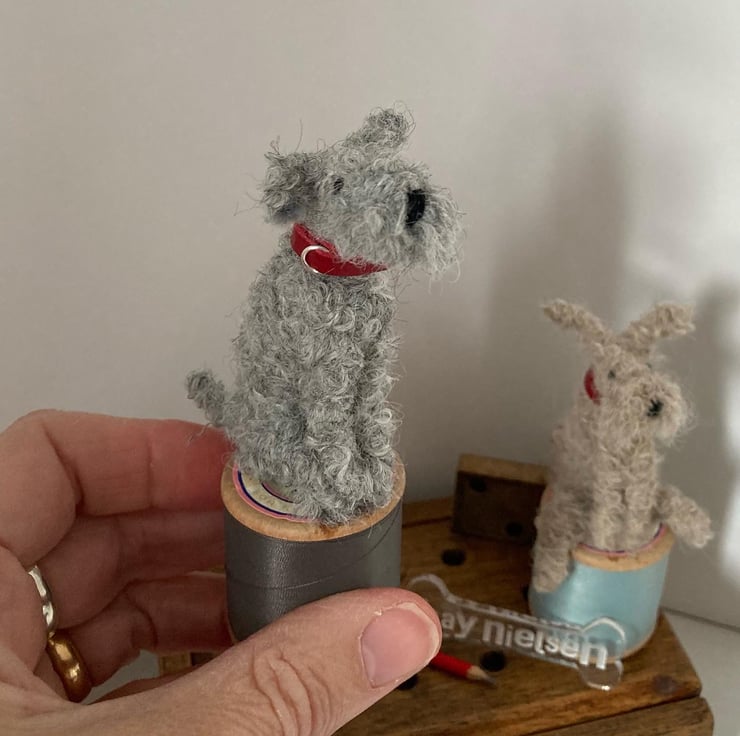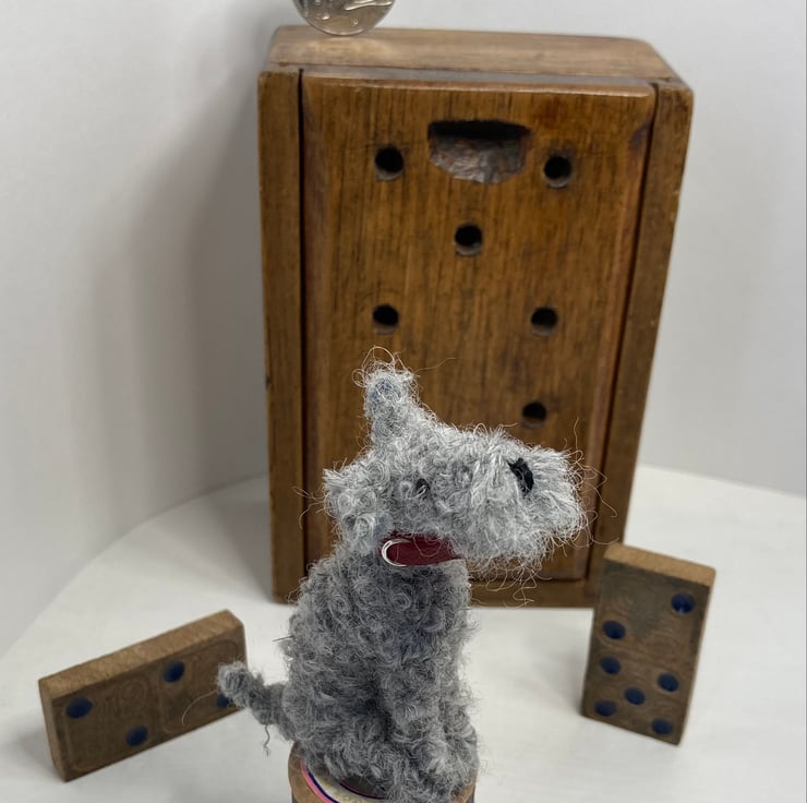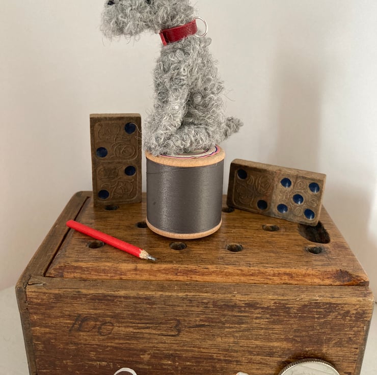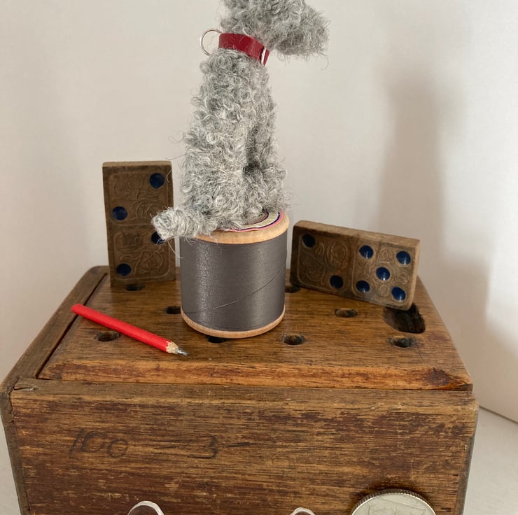 OOAK sculptured miniature dog on a vintage cotton reel. All my animals are hand finished with eyes and noses and, if needed, wool whiskers!