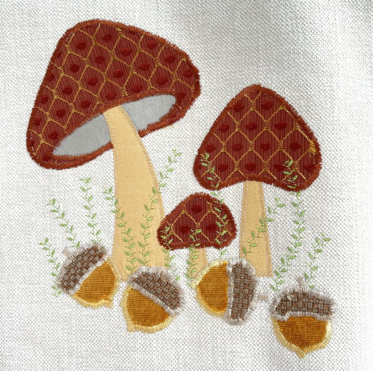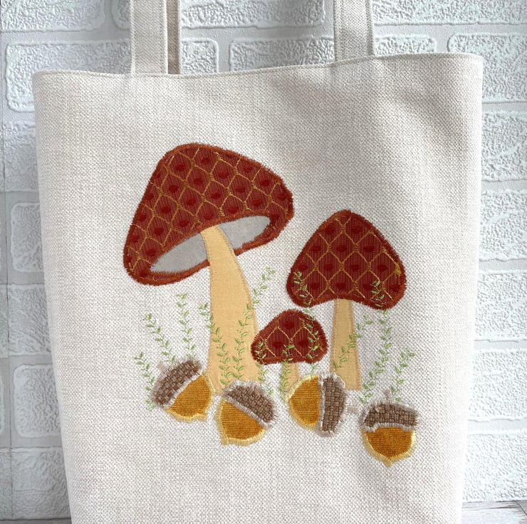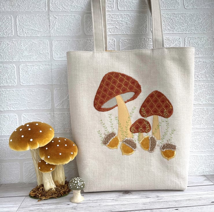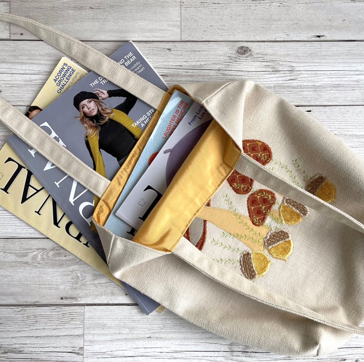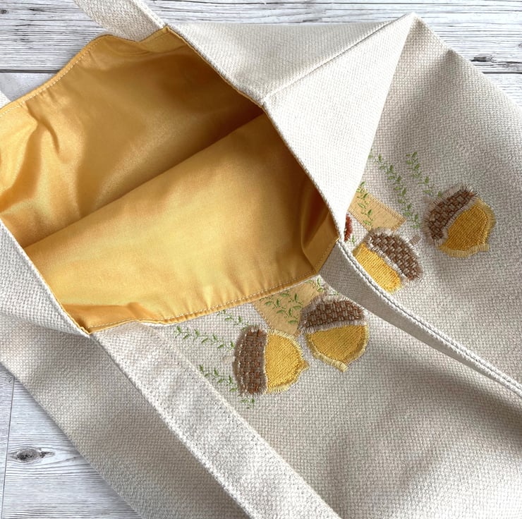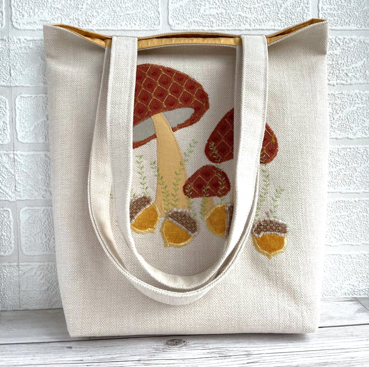 Mushrooms and acorns tote bag. A delightful woodland themed tote bag in cream fabric with an appliqué scene featuring mushrooms and acorns. The tops of the three toadstools are made from a lovely terracotta fabric with a gold lattice pattern and little velvety textured bobbles in terracotta. The stems are made from golden yellow fabric. The four acorns are made from beautiful golden yellow velvet and have caps of a rustic beige fabric. I've added some machine-embroidered leafy stems in zesty green thread. The bag is lined with golden yellow fabric with a gorgeous sheen.