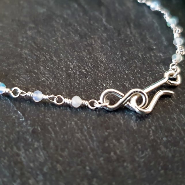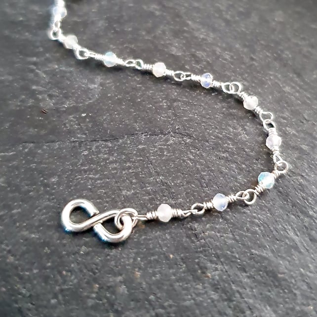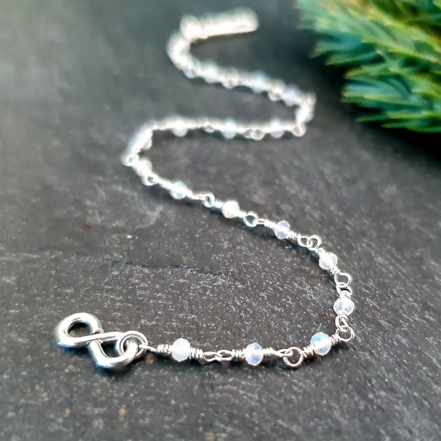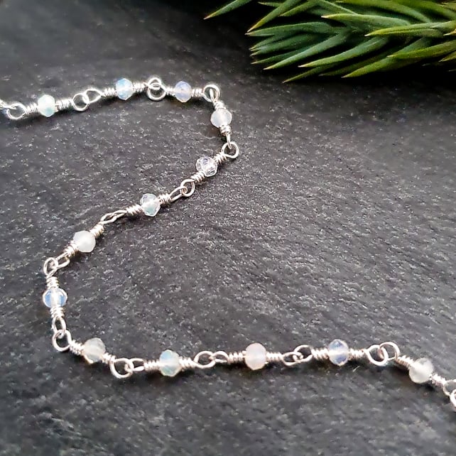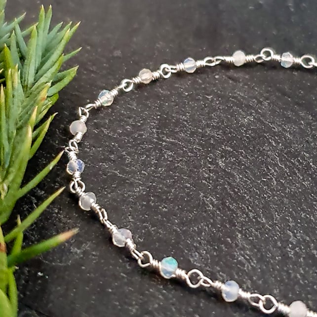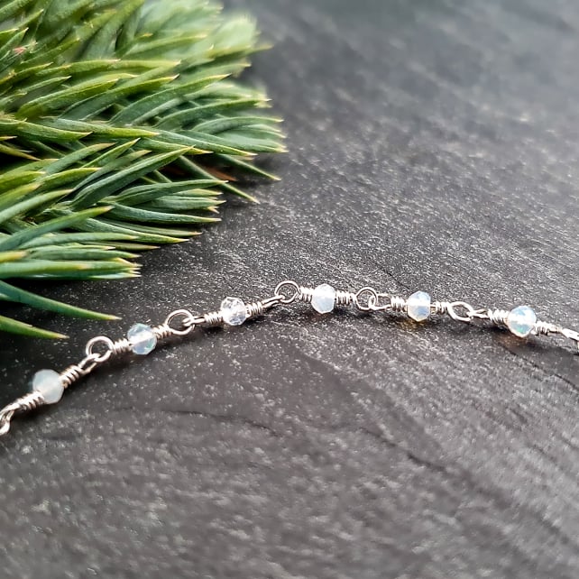 This delicate rosary chain bracelet has been handmade from recycled sterling silver wire and tiny 2x1.5mm micro-faceted Ethiopian opals. The opals have gorgeous flashes of colour in them that are really hard to photograph, and the facets also give them a lovely sparkle. It is finished with a dainty sterling silver hook and eye clasp.