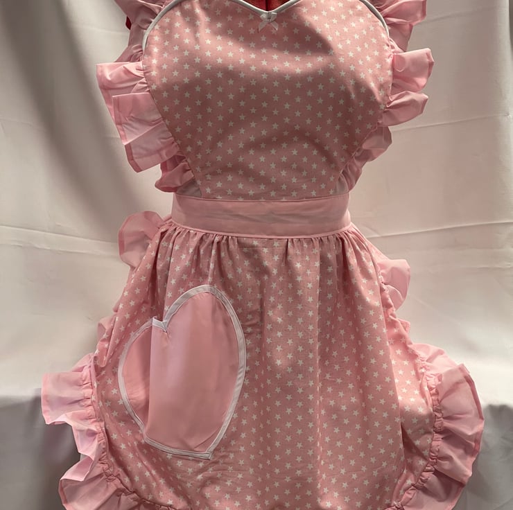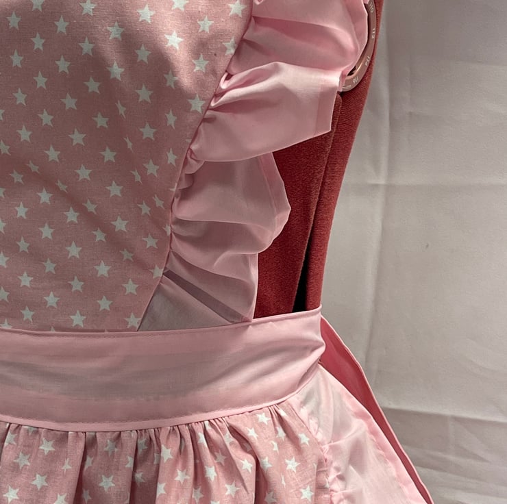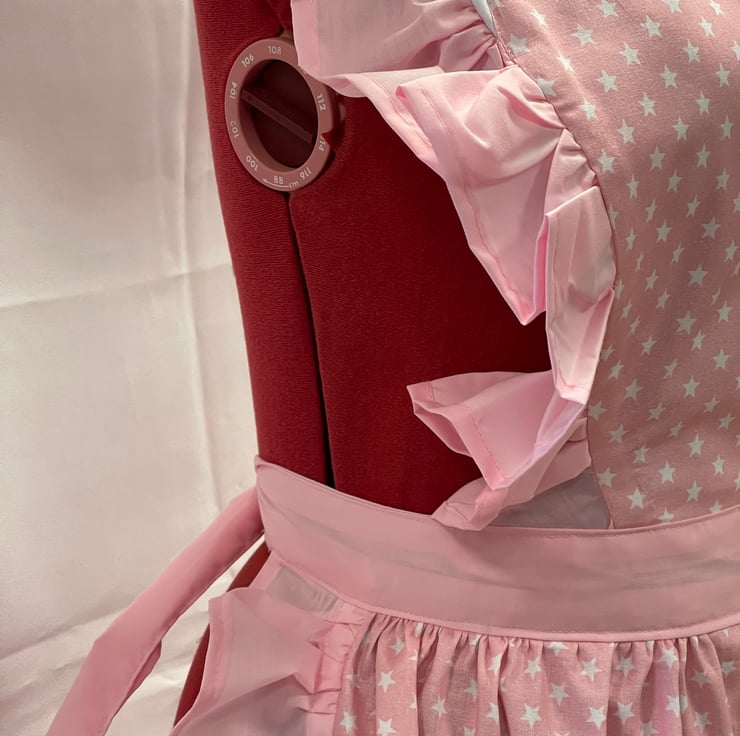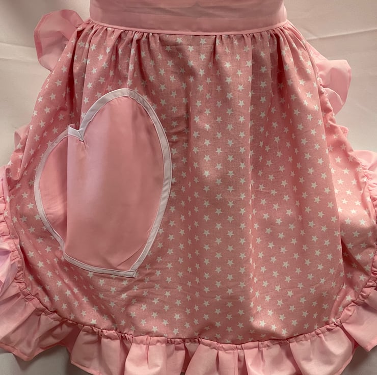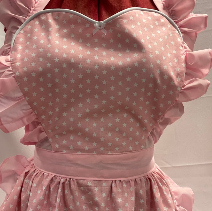 Here we have a lovely cotton rich candy pink with white stars and pink trim retro style apron with heart shaped top and pocket, handmade in house to our own design. (see photos). Adjustable neck and waist ties so will fit up to a size 22.