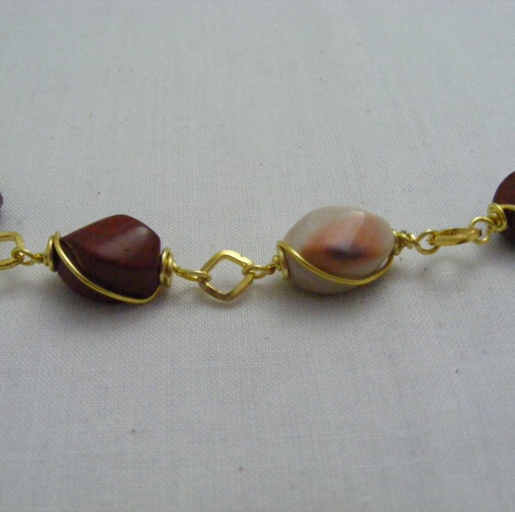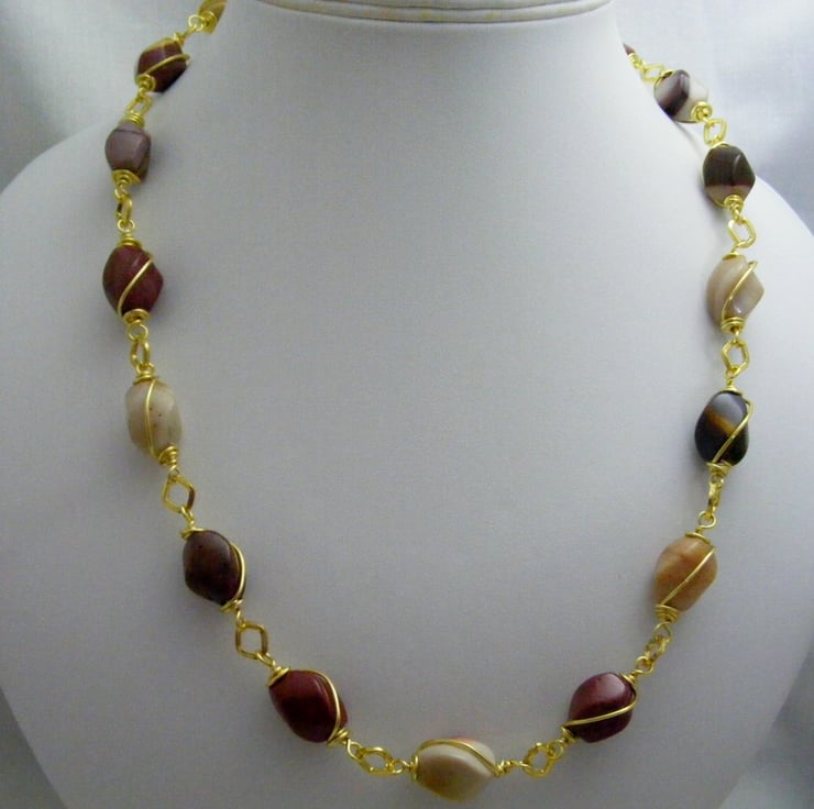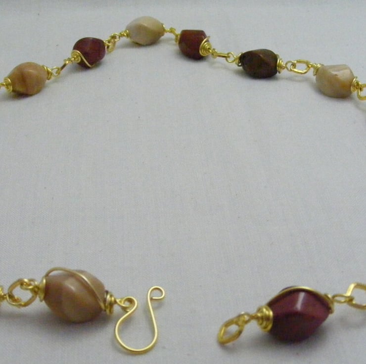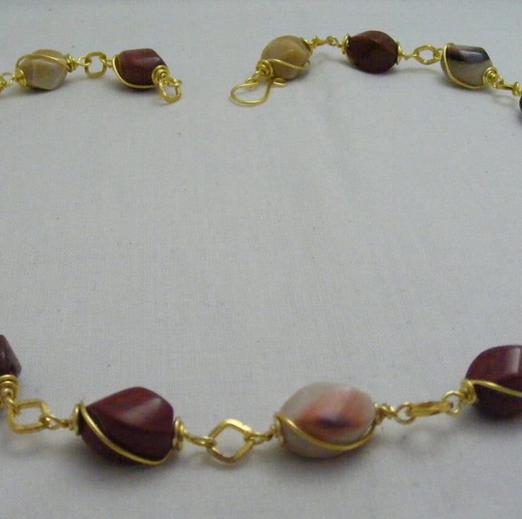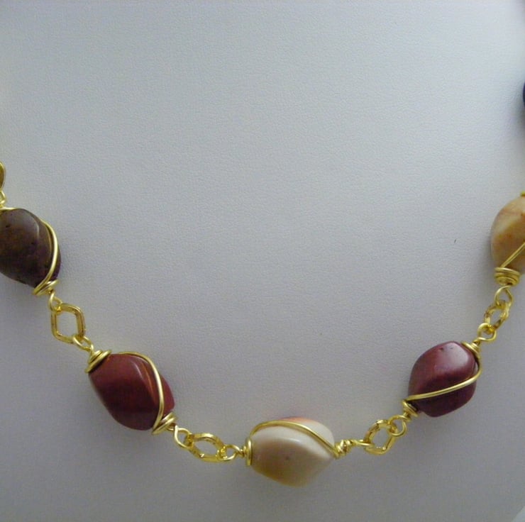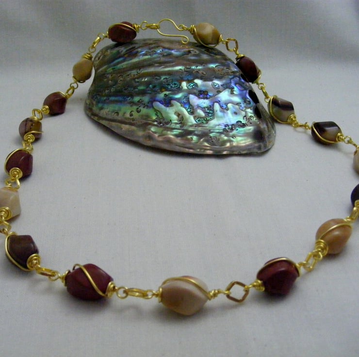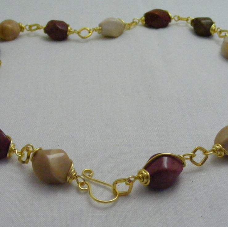 Handmade, one of a kind gemstone necklace made with, 15x10mm Mookaite twisted ovals, gold plated wire, gold plated diamond shaped links and a handmade clasp.