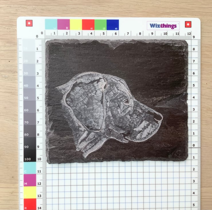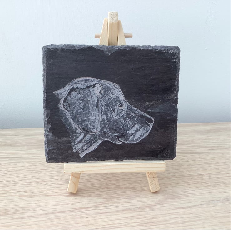 A carving of a Labrador head in profile. This dog picture is carved onto a piece of slate. It is provided with the display easel which is included in the price.