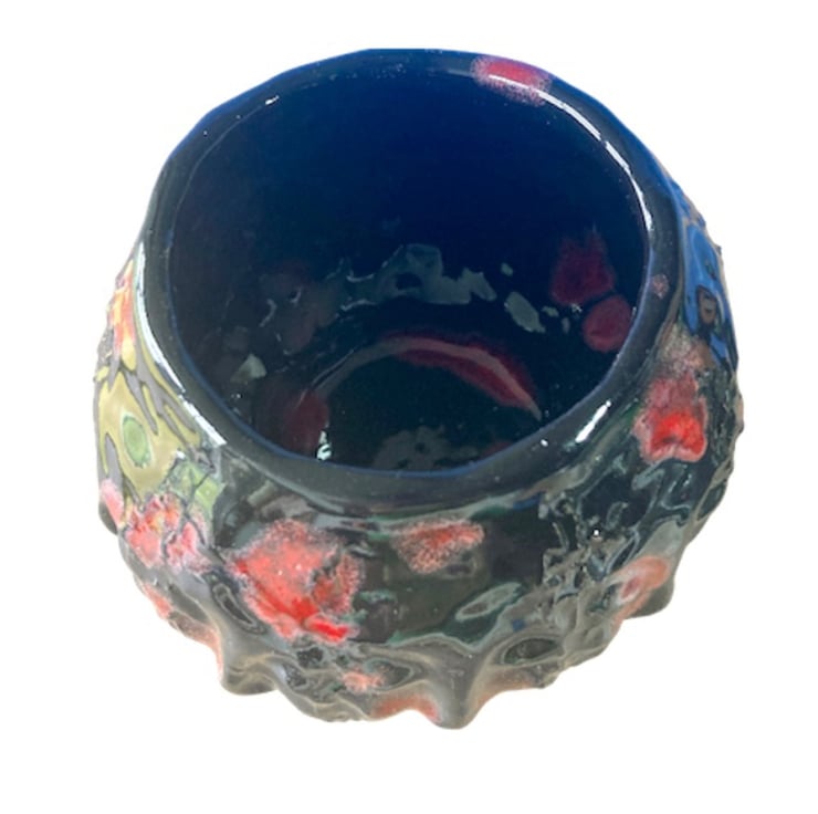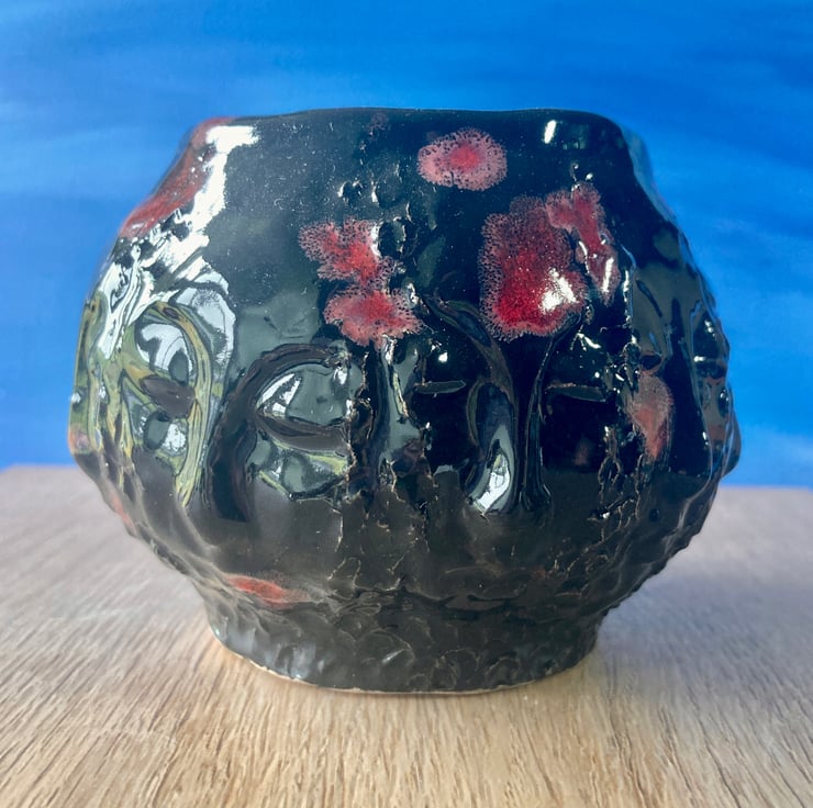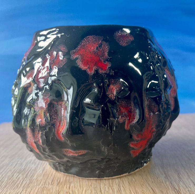 texture and finished with glossy black and red opal glaze, this unique little pot is a beautiful piece.