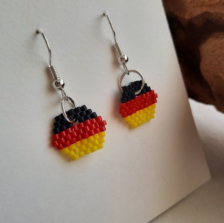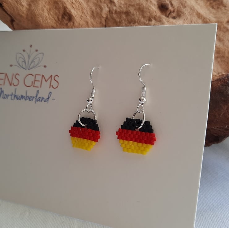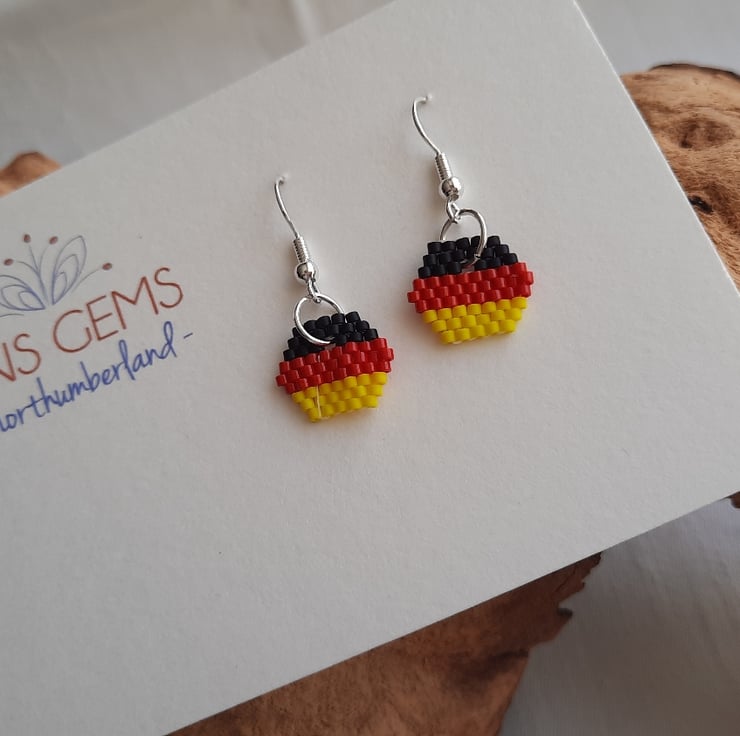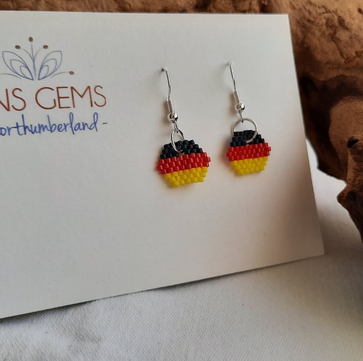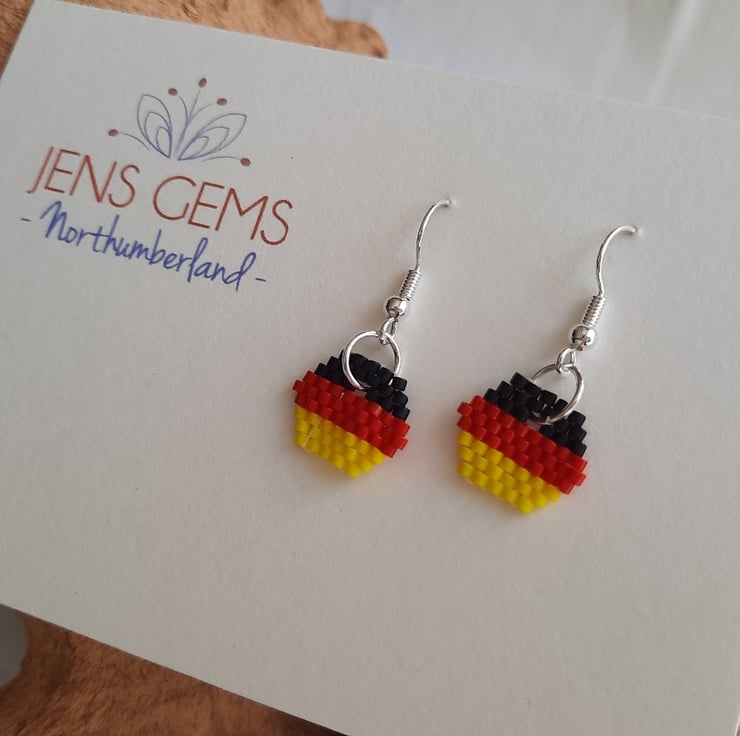 A pair of lightweight beadwork earrings in a hexagonal shape, made using Japanese Delica beads using the colours featured in the German flag. The earrings have a drop of approx. 1.5cm from the base of the ear wire and are approx. 1.5cm in width. The ear wires are silver plated but can be changed to sterling silver at checkout.
