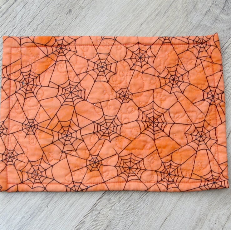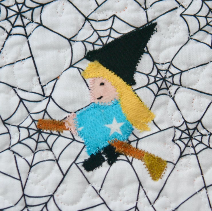 The front is a white fabric covered with spider webs and a Witch riding her broomstick appliquéd on the right hand side. The backing is orange with the same spider web pattern as the front. The two layers of cotton sandwich an eco-friendly polyester wadding made from recycled plastic bottles. The three layers are quilted together using a winding loop the loop pattern and the mug rug is bound with the backing fabric.