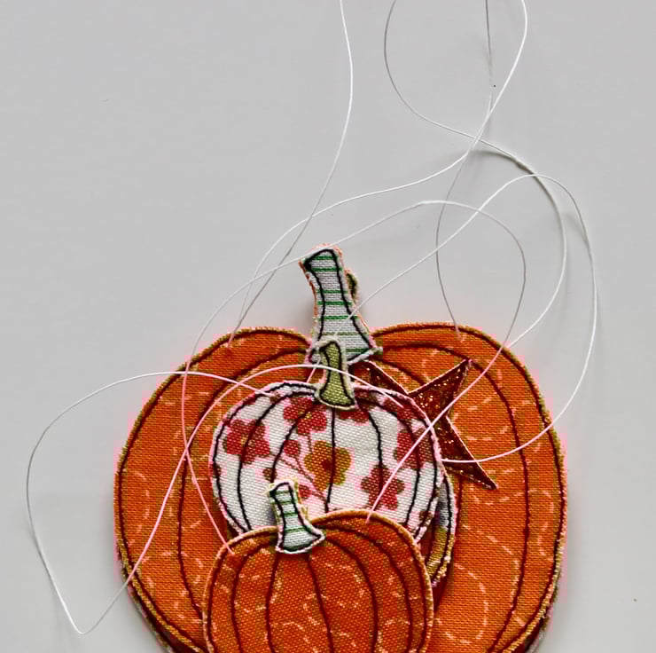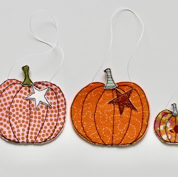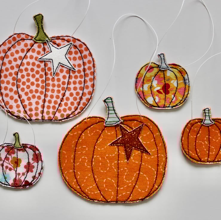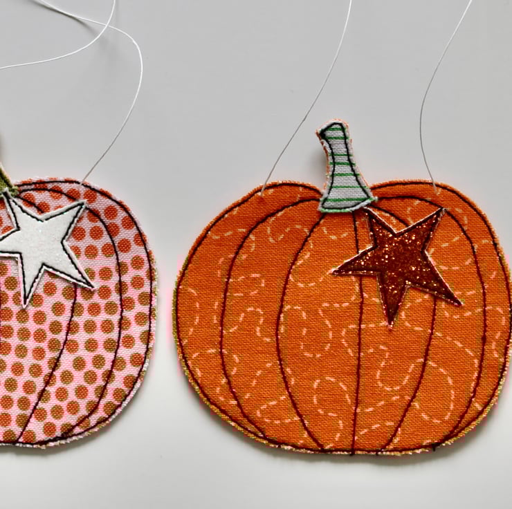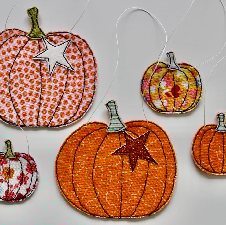 Each pumpkin is sewn using cotton cloth, glitter cloth and free hand machine embroidery; multiple layers of cloth are sewn together and cut out by hand using very sharp scissors. With a linen string to suspend.