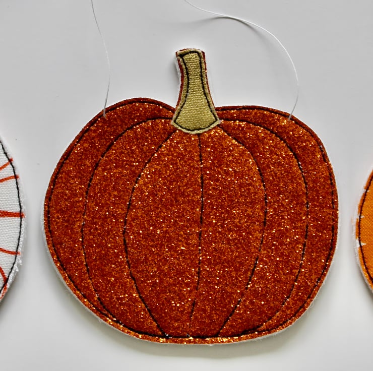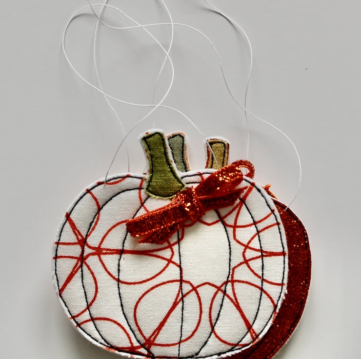 Each pumpkin is sewn using cotton cloth, 100% wool felt and free hand machine embroidery; multiple layers of cloth are sewn together and cut out by hand using very sharp scissors. With a linen string to suspend.