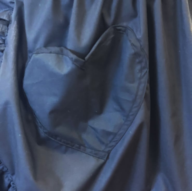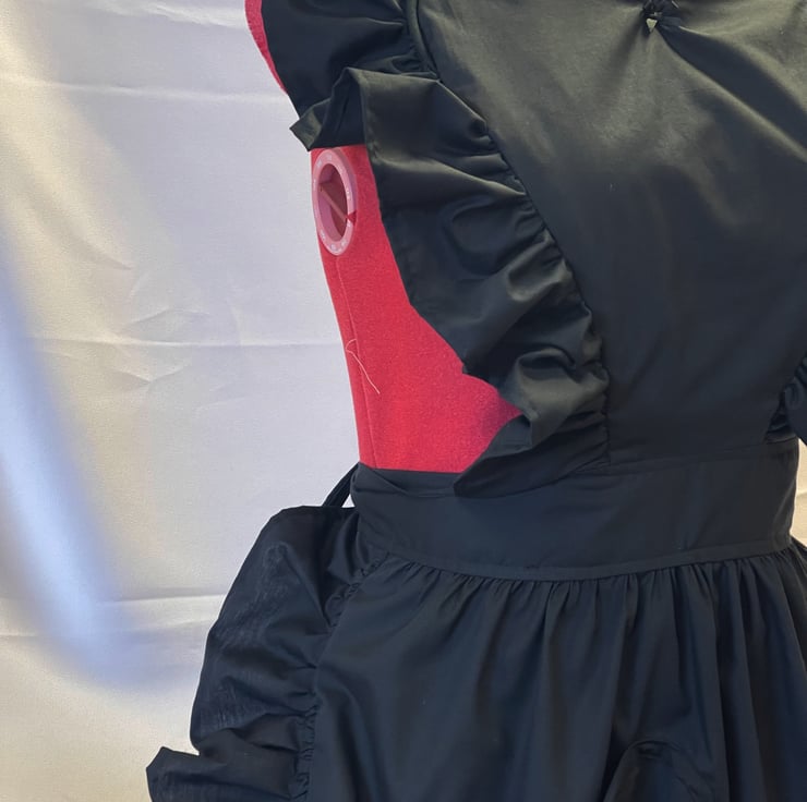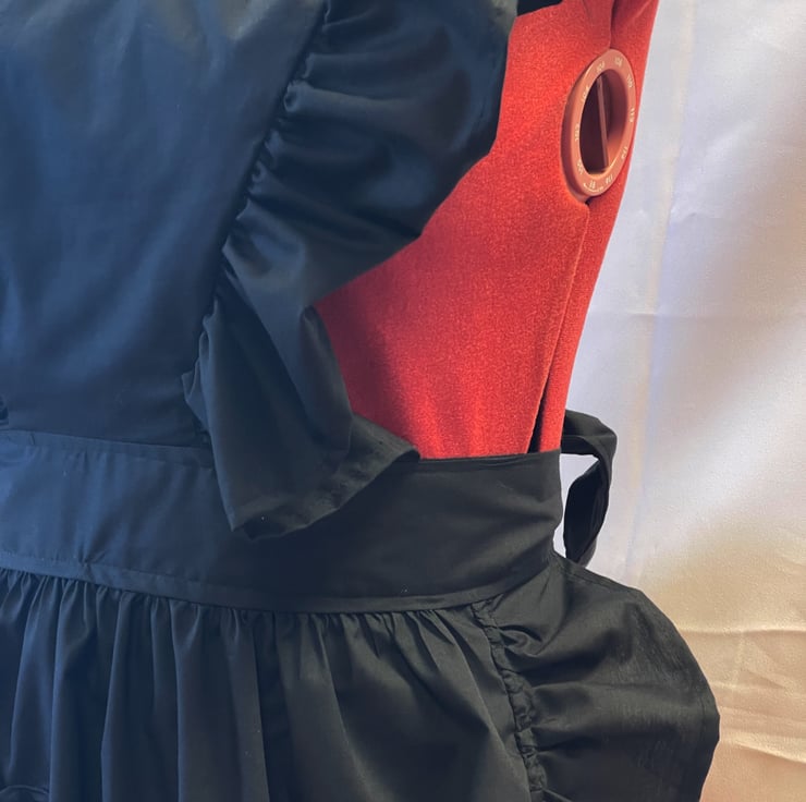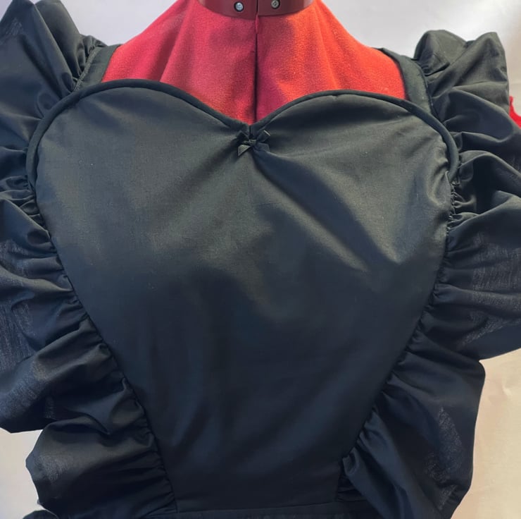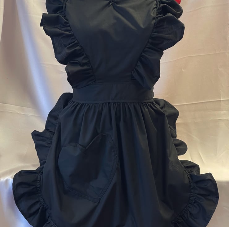 Here we have a lovely poly cotton, black, retro style apron with heart shaped top and pocket, handmade in house to our own design. (see photos). Adjustable neck and waist ties so will fit up to a size 22.