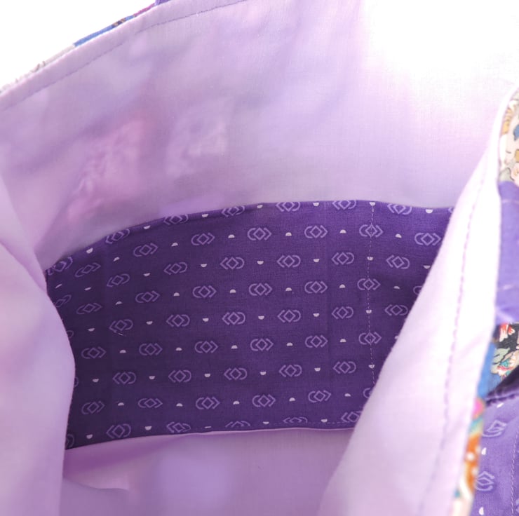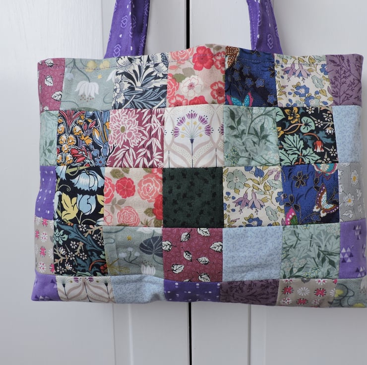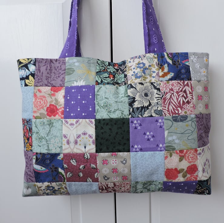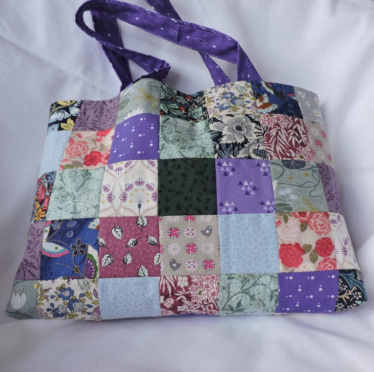 A colourful tote bag which has been made with a patchwork of small cotton squares of purple, pink, blue and green fabrics. Assorted fabrics of different colours and patterns. It is fully lined with a plain pale pink cotton fabric and has a full width divided pocket in a purple patterned cotton fabric. It has interfacing to give stability and a squared off bottom. This eco friendly bag folds easily to fit in a pocket, bag or suitcase making it the perfect reusable tote bag.