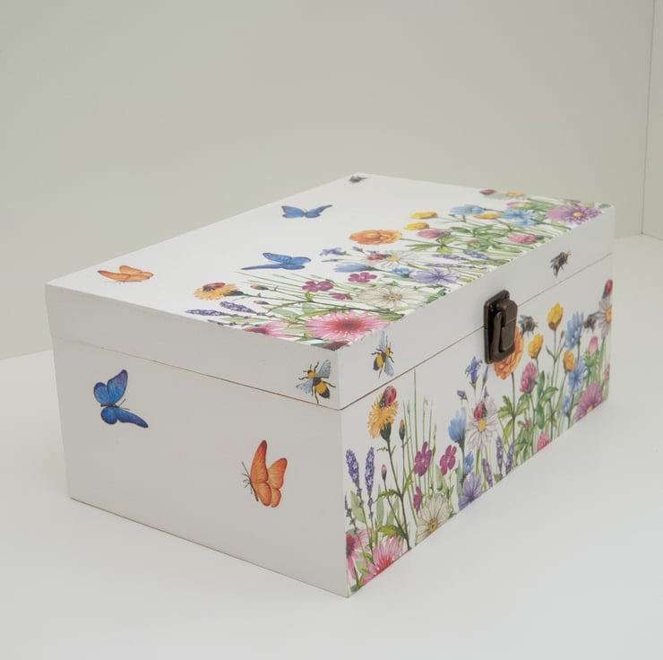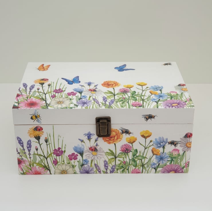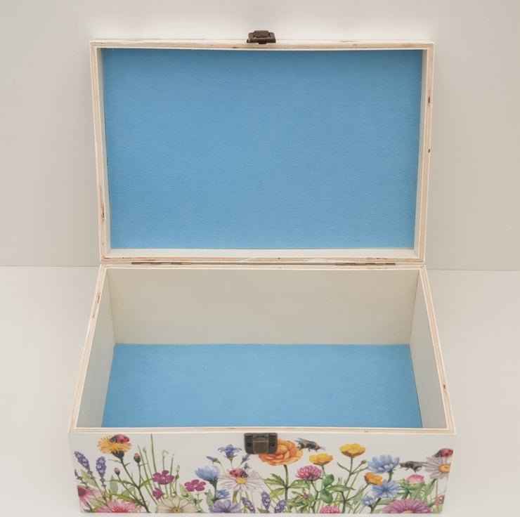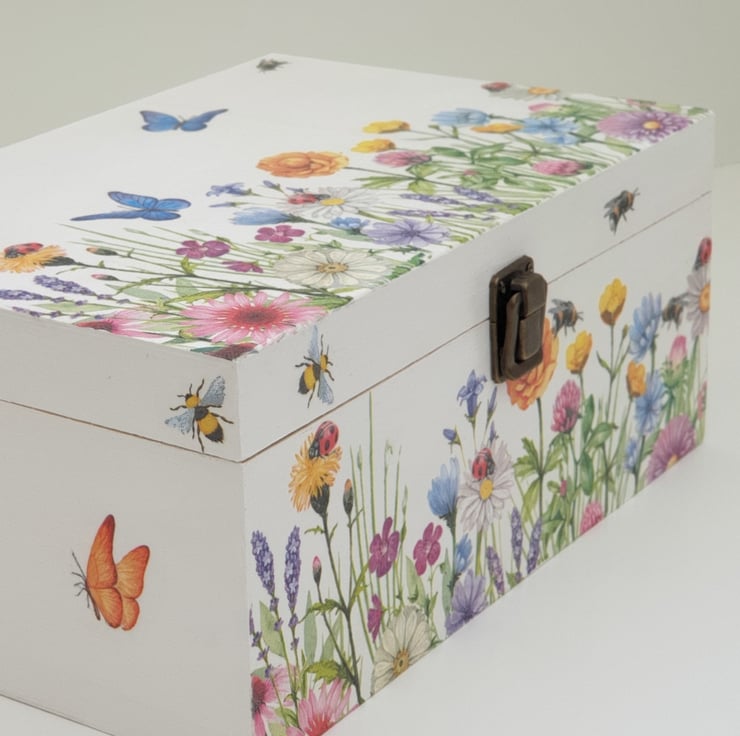 Very pretty wooden memory keepsake box which has been lovingly decoupaged with beautiful meadow flowers, butterflies, bees and dragonflies and then finished with several coats of interior satin varnish. The box has a secure metal clasp and the interior of the box has been lined with matching pale blue felt.