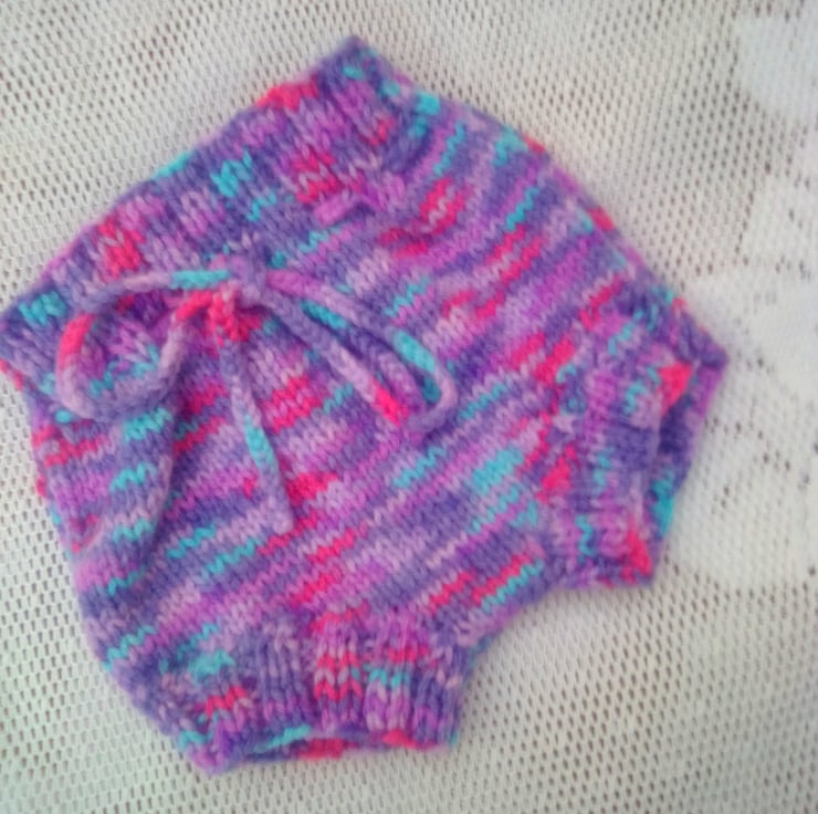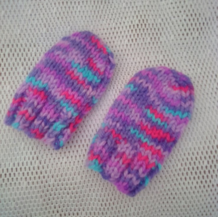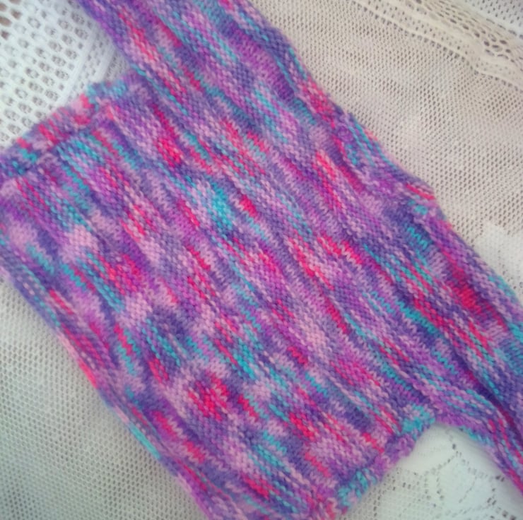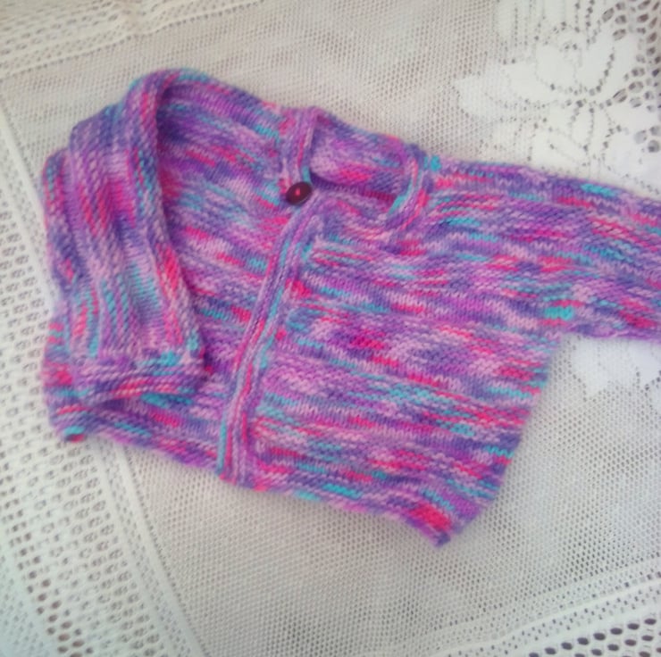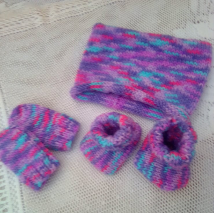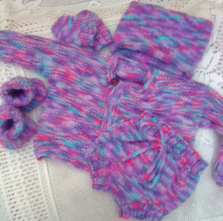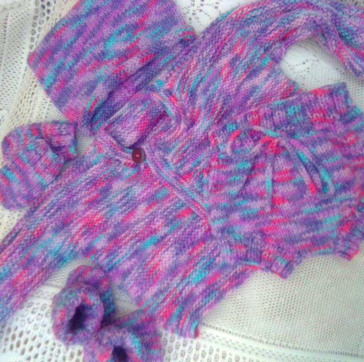 The set is in stock in a size to fit a 0 - 6 month old baby with a 16 inch chest. It is hand knitted in a variegated purple double knitting yarn. It can also be made in a size and colour of your choice, just let me know what you would like. Available sizes are shown below and state your colour choice when you order. The processing time to produce this and to post it out to you will be between 1 and 2 weeks.