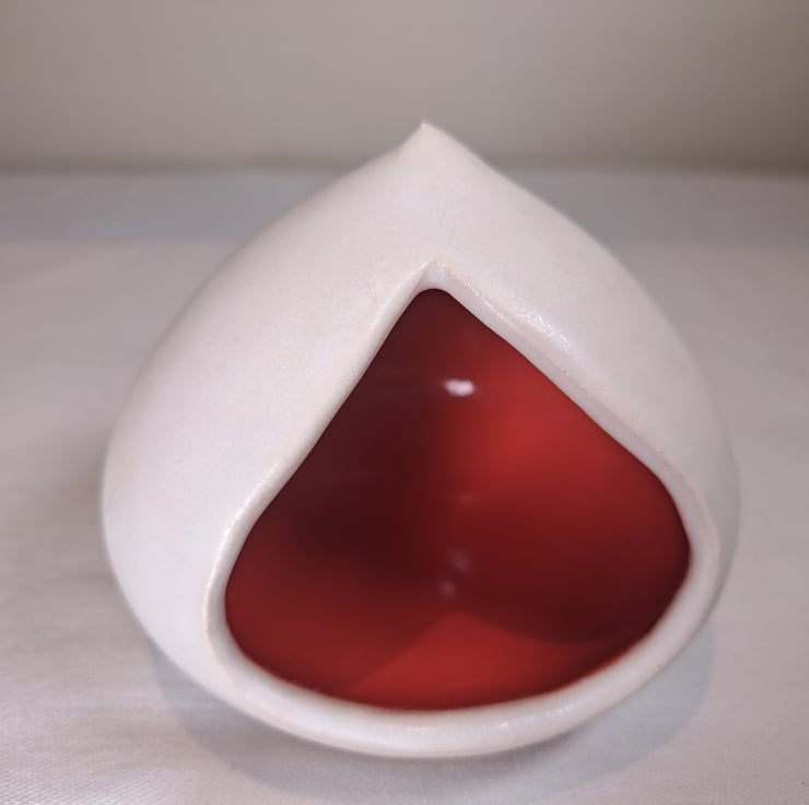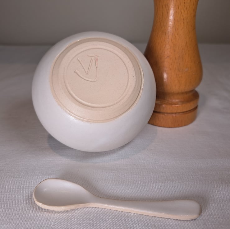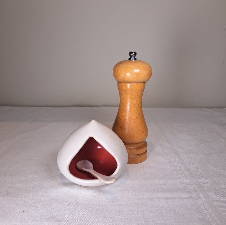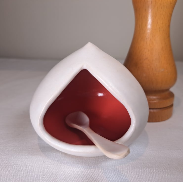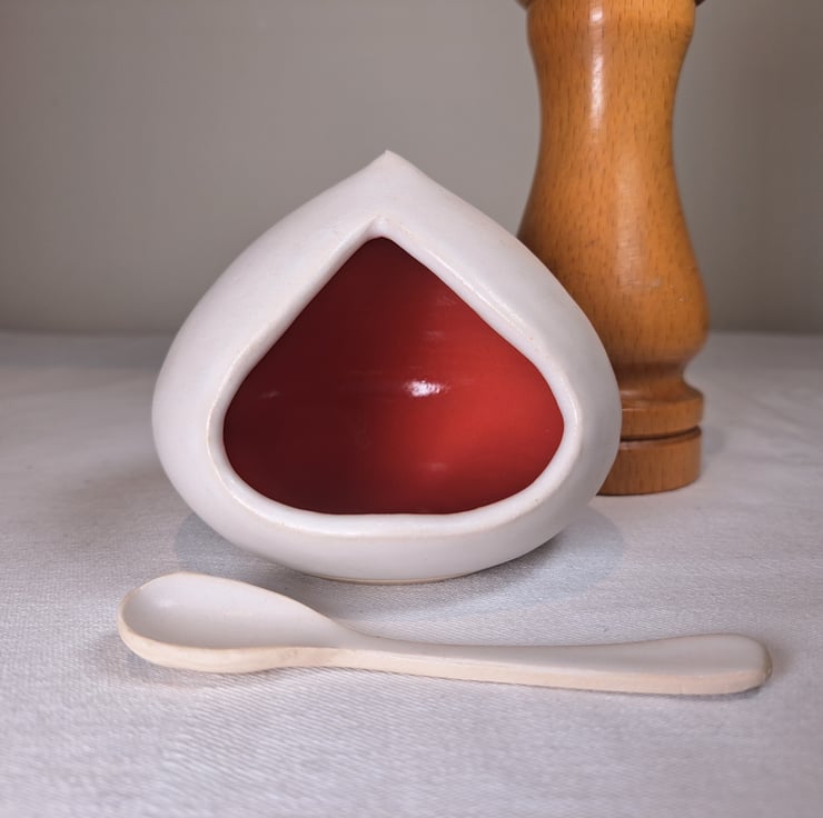 The salt pig is made from white stoneware and glazed in a glossy red on the inside and a satin white on the outside and goes in the dishwasher.