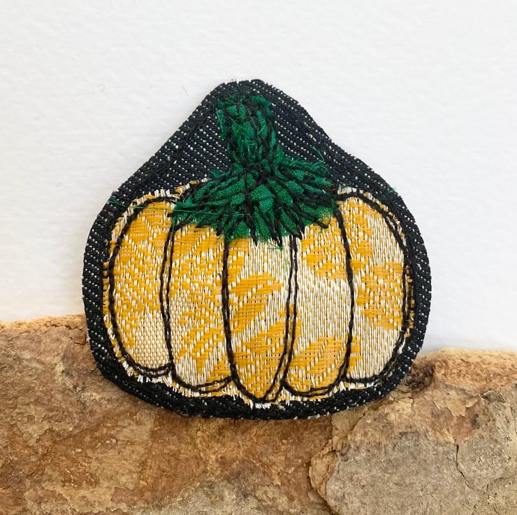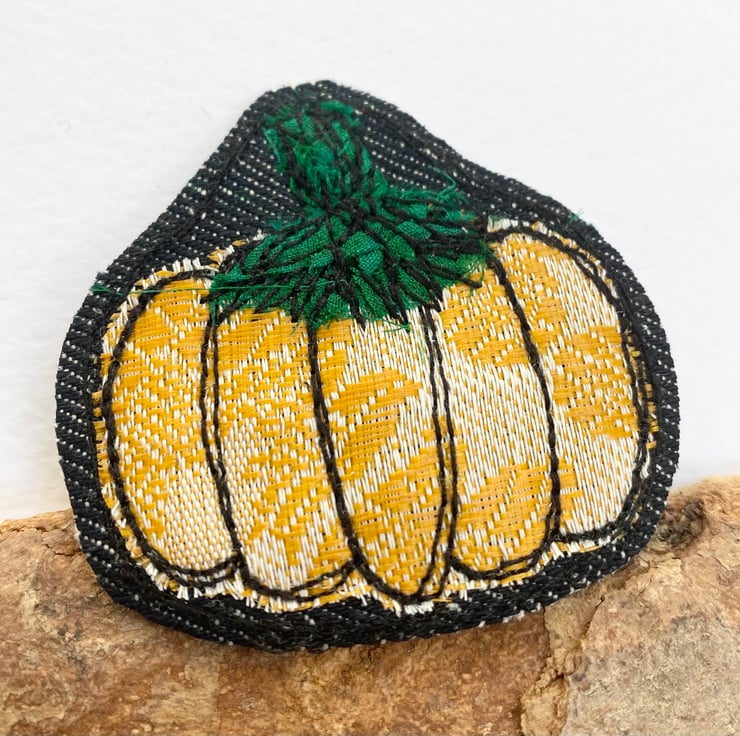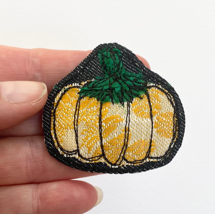 This beautiful handmade free motion embroidered pumpkin brooch is made from up-cycled fabrics. It is denim backed, and has a brooch pin on the reverse to keep it nice and secure. It measures 5.5 x 5cm approx.