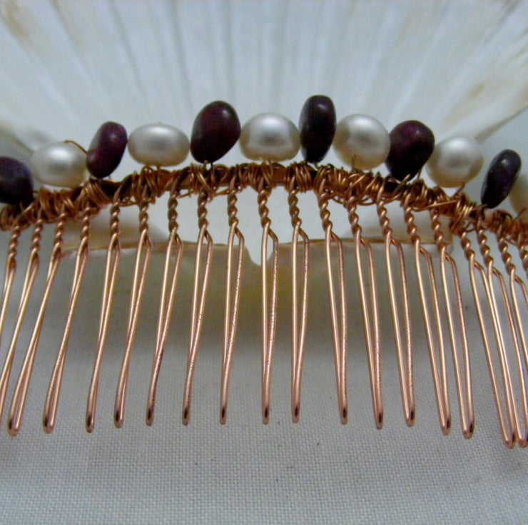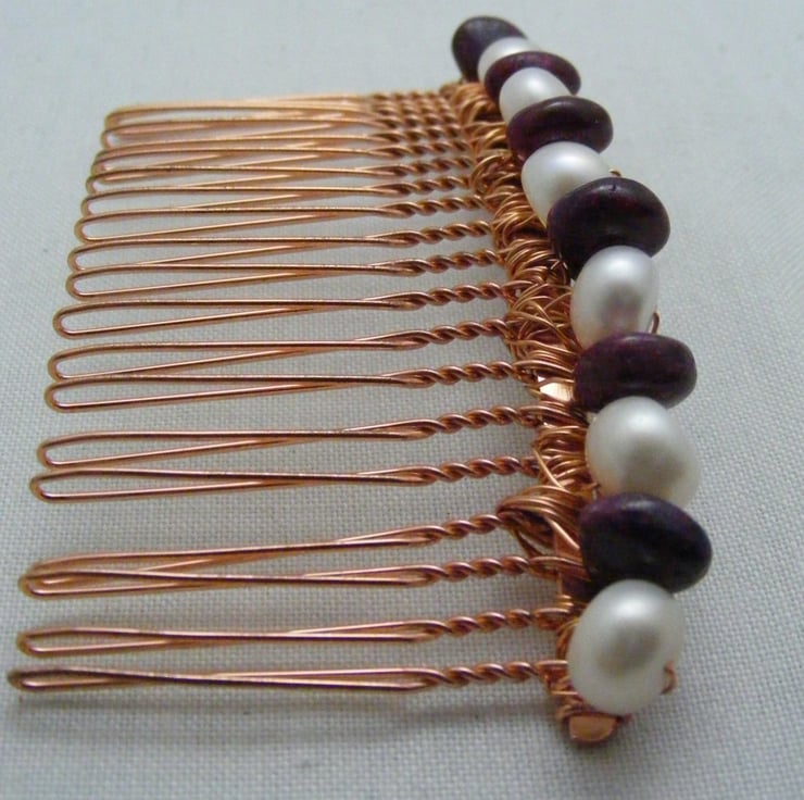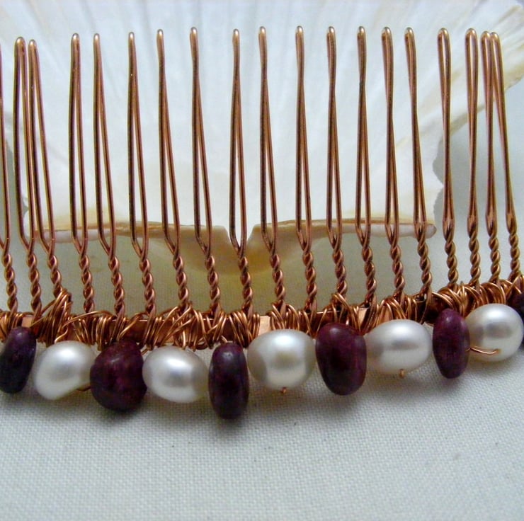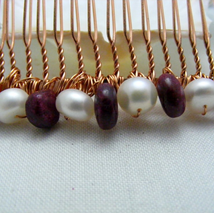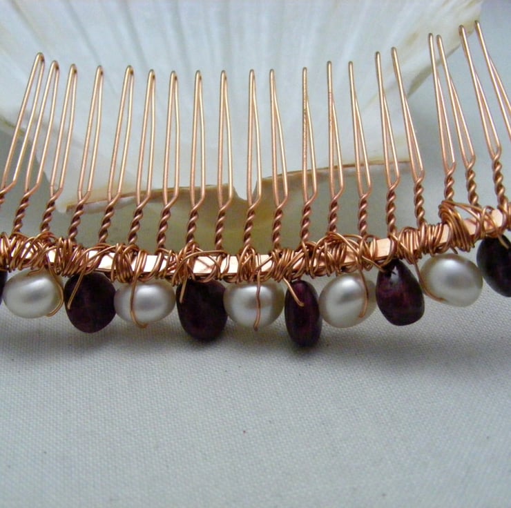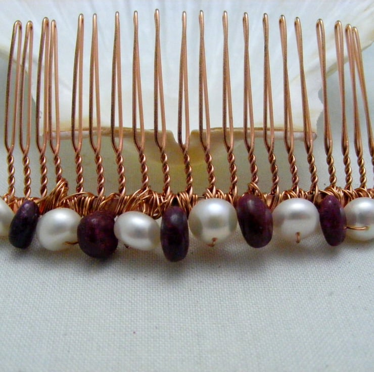 One of a kind gemstone hair accessory handmade with, rose gold plated hair comb, 8mm ruby gemstone drops, 8x5mm white freshwater pearl rondelles and rose gold plated wire.