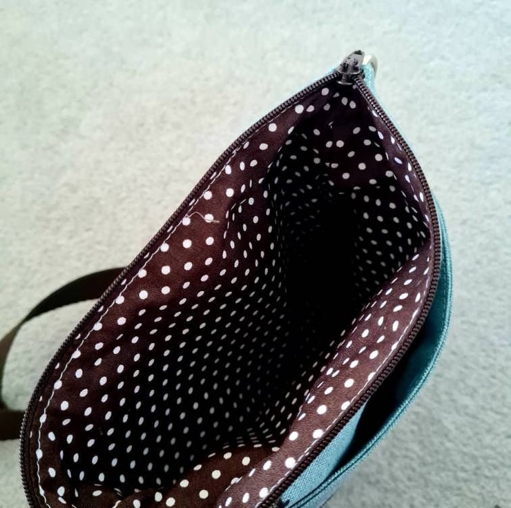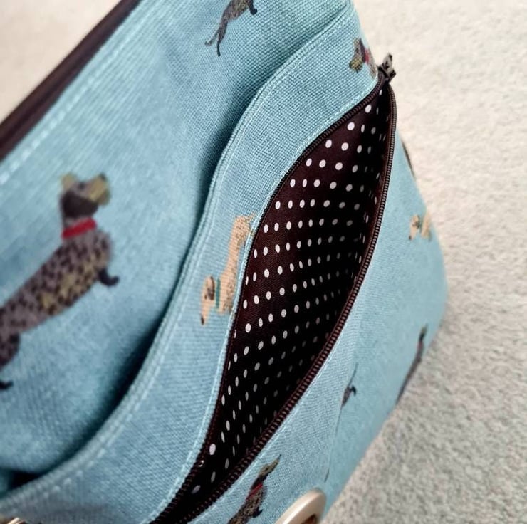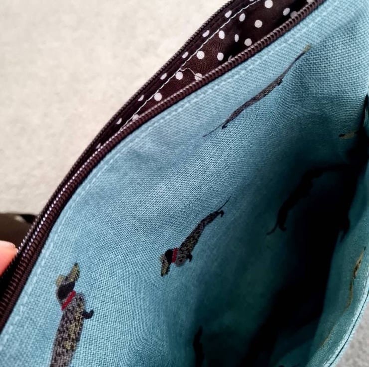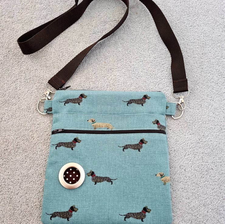 This is a dog walking bag made in Sophie Allport's Dachshund fabric.