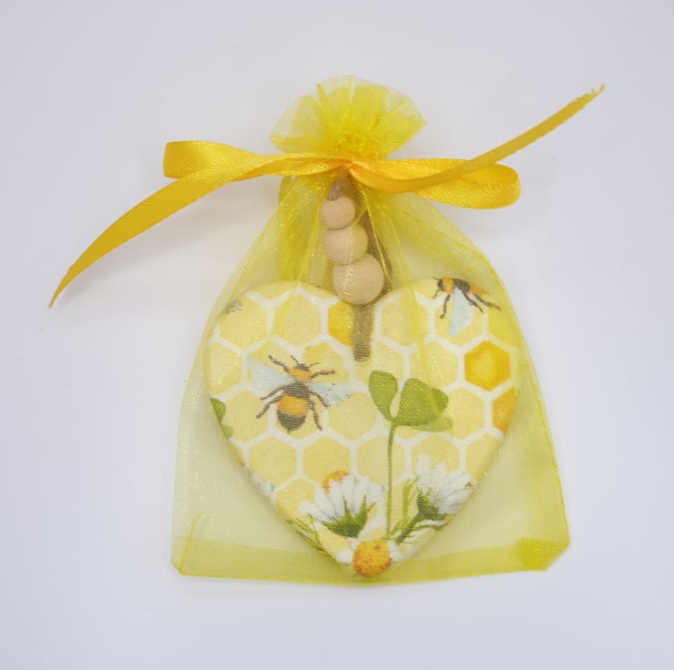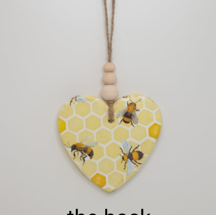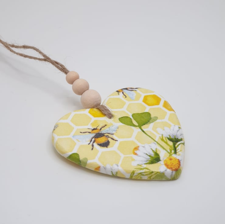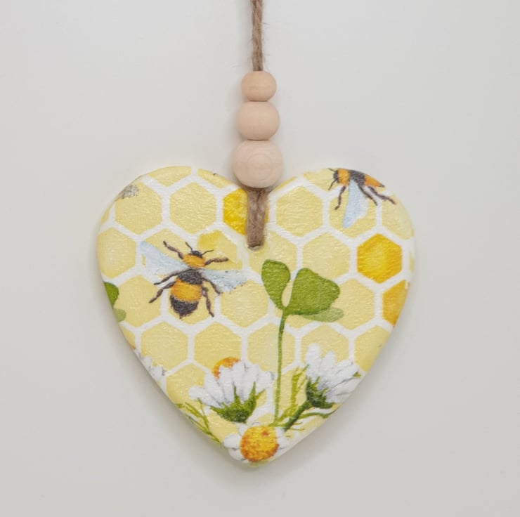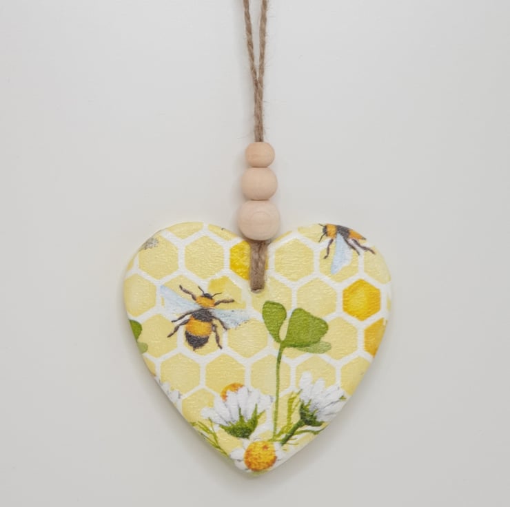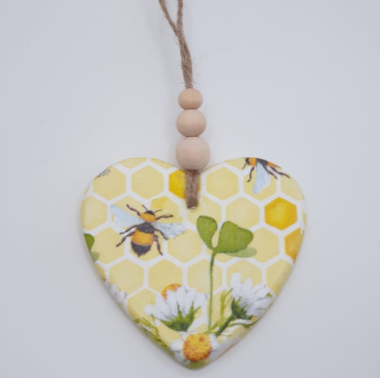 Pretty heart which has been lovingly handcrafted from air dry clay and then decoupaged with busy little bees on both sides and varnished for protection. This sweet heart would look lovely hung in a window, from a handle, furniture or from a gift bag. This decorative heart comes ready to hang with twine and is finished with 3 wooden beads. Supplied in a pretty organza bag finished with ribbon making a perfect gift.