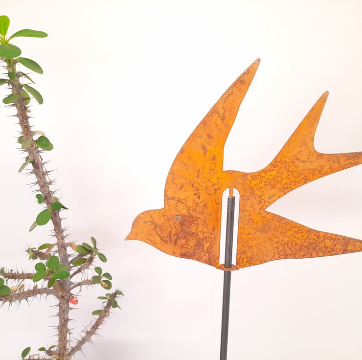 Twirly Whirly Birds are my collection of garden bird sculptures that spin in the wind. Each Bird can be bought with a rusty finish or a colourful finish. A simple design with a smooth movement. Twirly Whirly Birds work well as individual birds and look great as a collective group, enhancing the movement and colour of any outdoor space.
