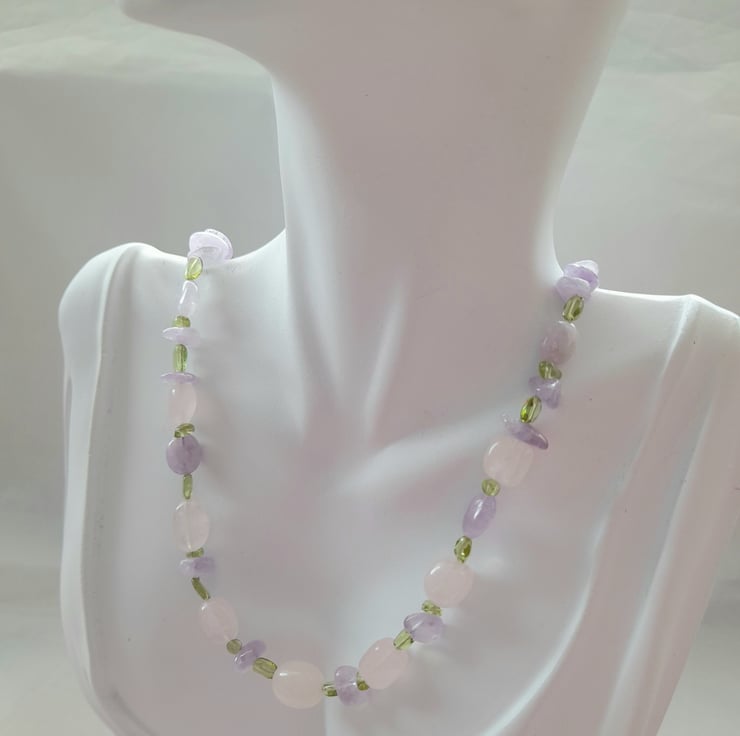 Lovely pastel tones of rose quartz, peridot and lilac amethyst semi precious gemstones are attached to a silver plated toggle clasp.