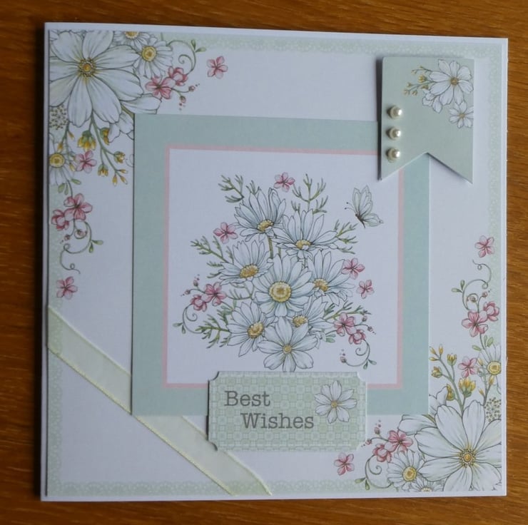 The main square focal image of a daisy bouquet has been mounted onto a co-ordinating card background with floral corner details and a yellow organza ribbon across the bottom left hand corner. A small pennant style flag, again with a daisy motif, has been added to the top right corner and finished with 3 cream faux pearls. This has been raised from the card to create interest.