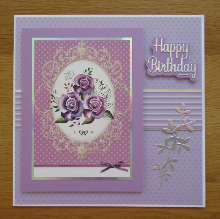 This pretty card in lilac and purple features the image of some roses surrounded by a decorative frame. The image has a border of silver mirror card and these have been raised with 3D foam pads to add depth to the card, as has the Birthday greeting. The insided has been finished to coordinate with a stamped verse as pictured.