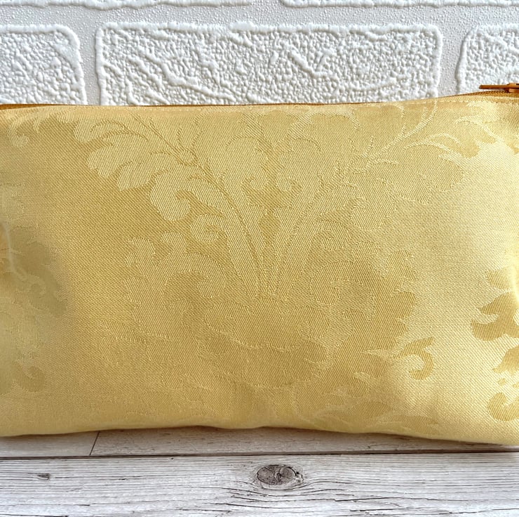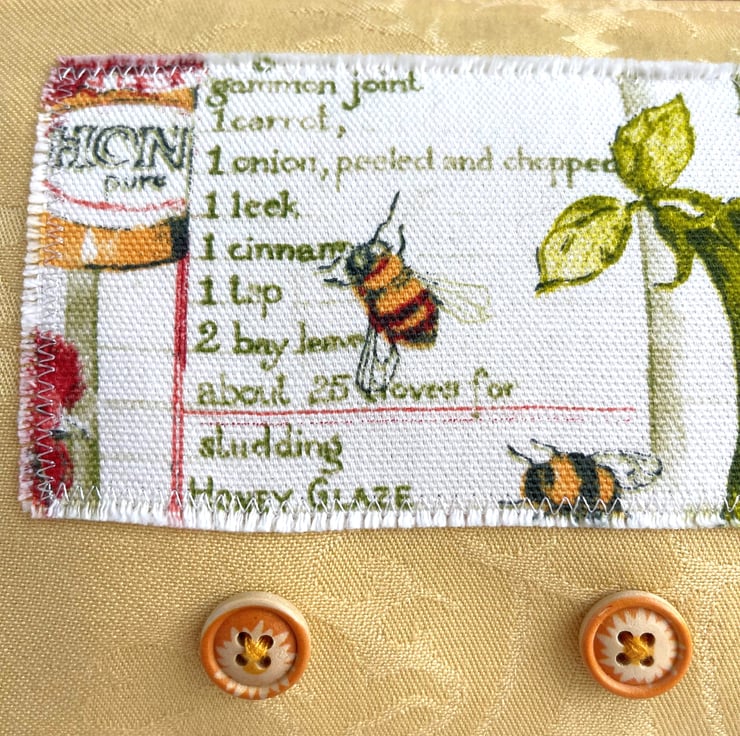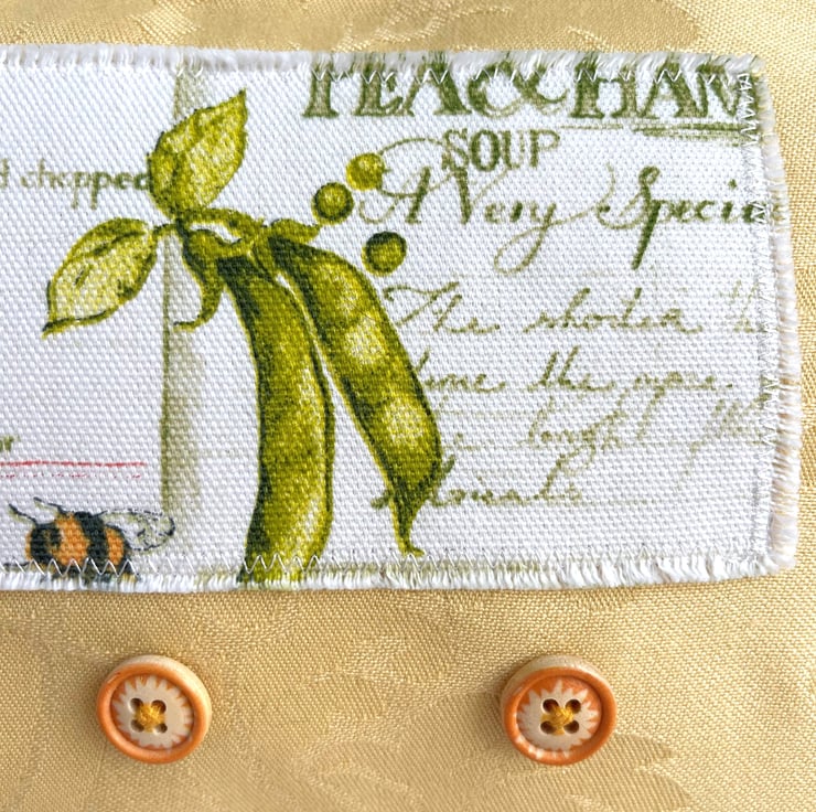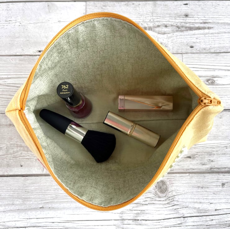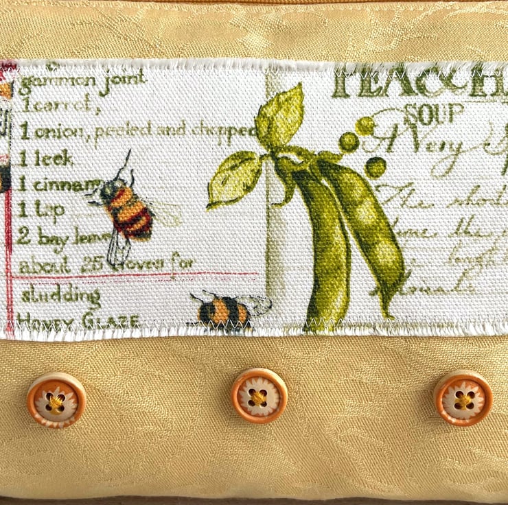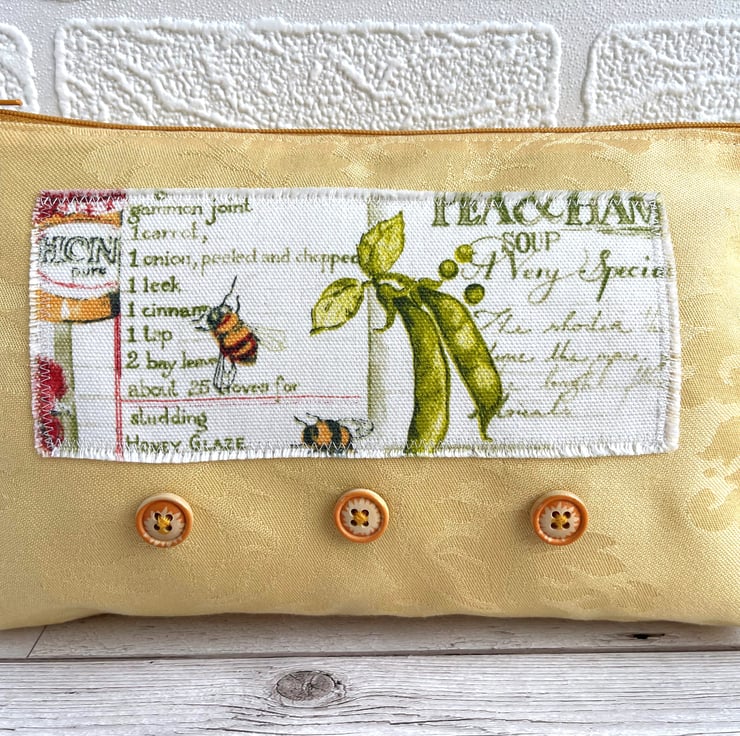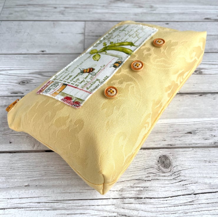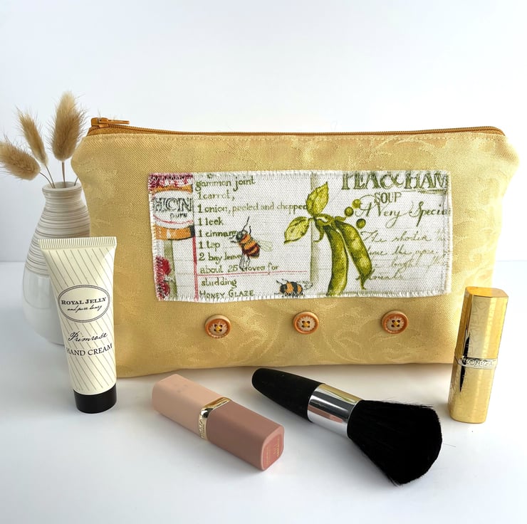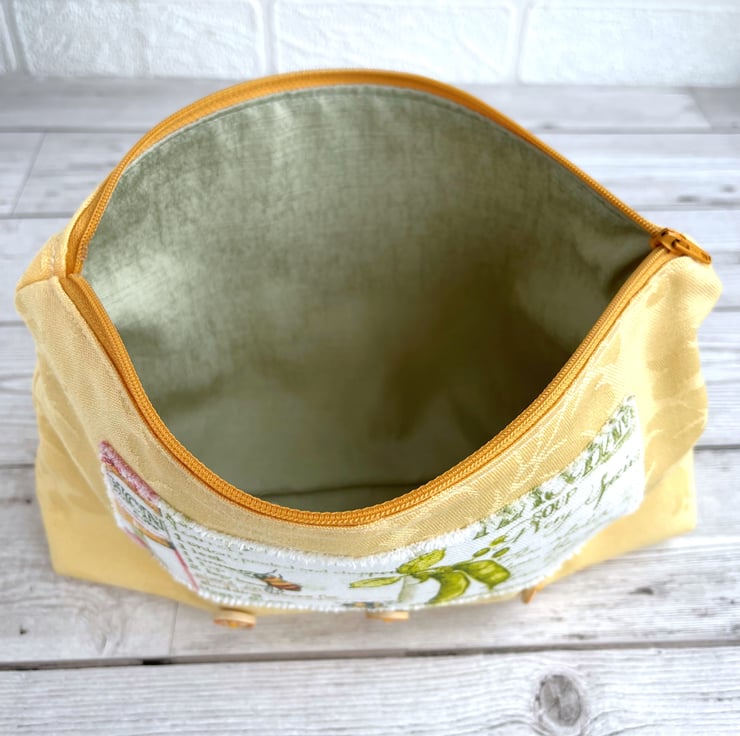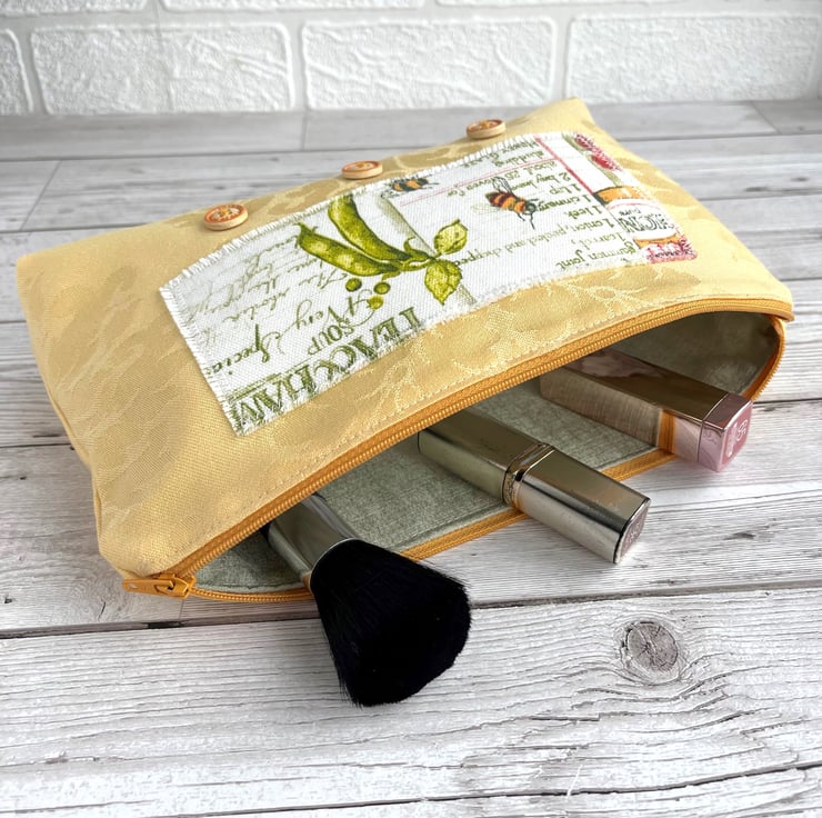 Large yellow make up bag with farmhouse kitchen decorative panel. This lovely large sized make up bag is made from gorgeous golden-yellow damask fabric with a subtle pattern in the weave. For the decorative panel I've cut a piece from some lovely rustic farmhouse kitchen print fabric. The panel is white with a pattern that features bees, pea pods and a jar of honey in front of recipes in green script. I've edged the panel with small machined zigzag stitch in white thread, and I've frayed the edges of the panel to add to the rustic theme. Under the panel I've added three round natural wood buttons with golden yellow edges. The make up bag fastens with a matching golden yellow zip and is lined with beautiful pale sage green fabric with a mottled sheen. The base of the bag is boxed giving lots of space inside.