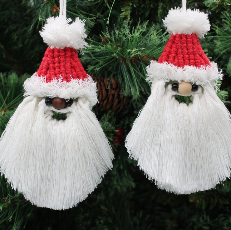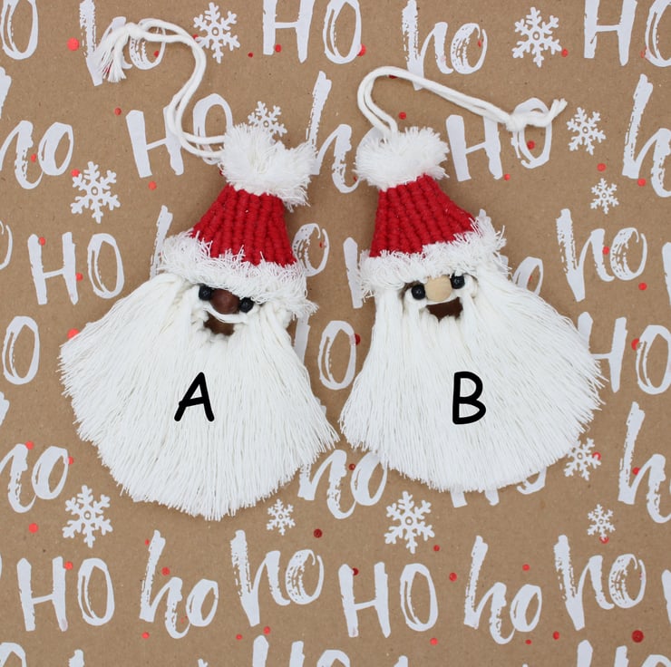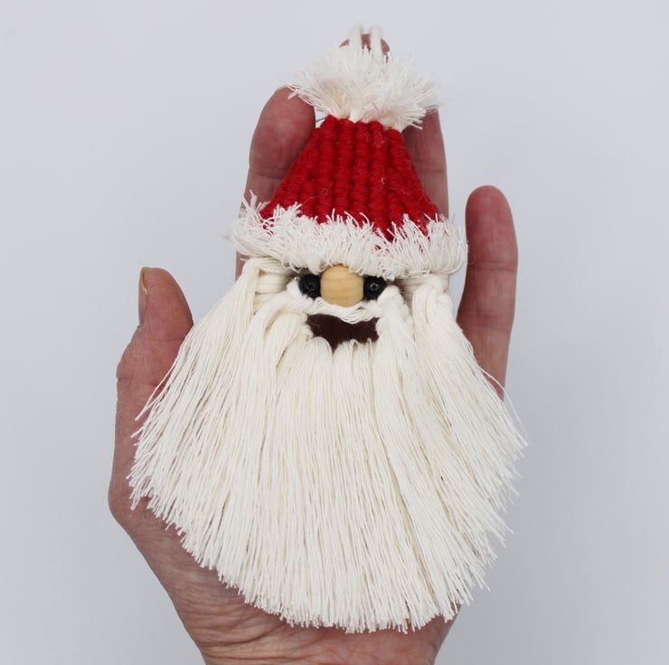 Jolly smiling Santa hanging decoration to brighten up the Christmas tree. He has been crafted around a wooden ring using my own design. I have used 100%recycled cotton to make his happy macrame face and red hat. For his eyes I have used black wooden beads and his nose is a natural wooden bead. For the ethnic Santa I have used a watered down acrylic paint for the nose and ring colouring.
