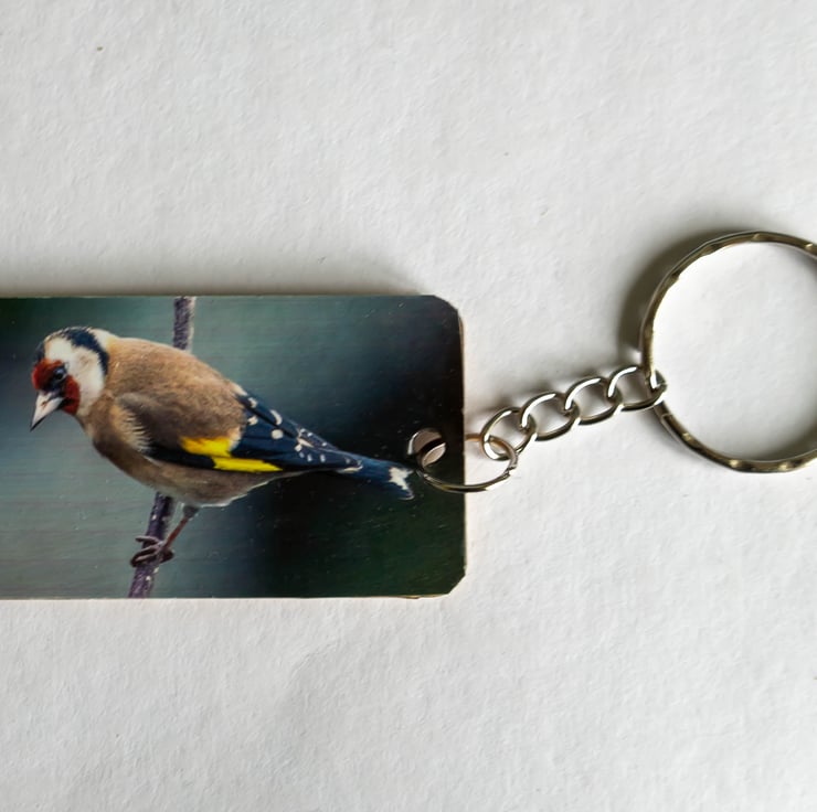 Wooden eco-friendly keyring featuring a photo of a goldfinch sitting on the branch of a Rowan tree. (Photo taken by myself in my garden).