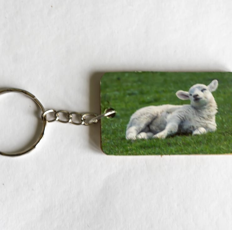 Handmade, wooden, eco-friendly keyring featuring a photo of a young lamb sleeping in the sunshine. I took the photo at Woodoaks Farm in Hertfordshire whilst walking in the surrounding countryside.