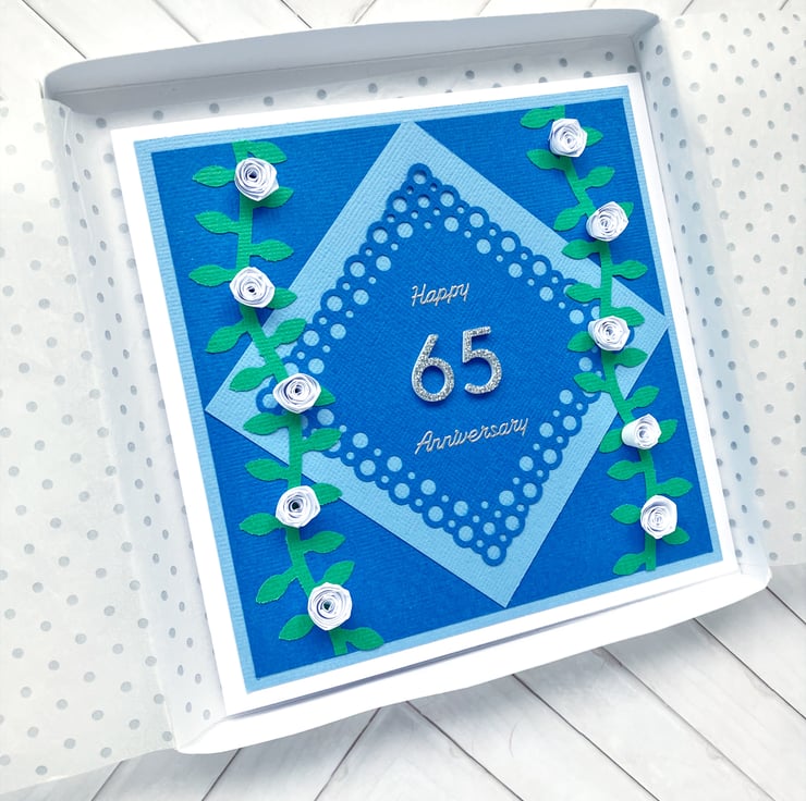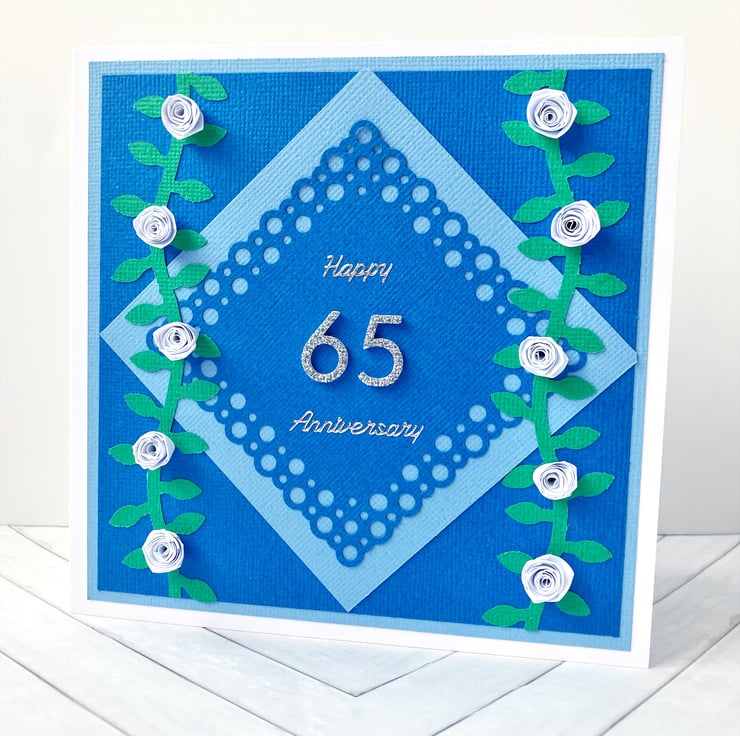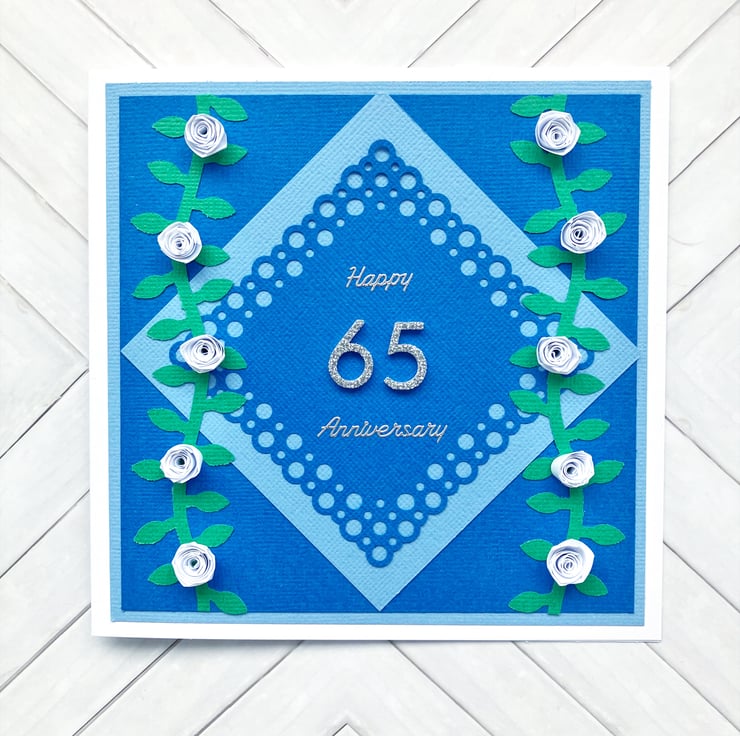 This card has two shades of blue with white quilled roses and a glittered 65 in the centre. The greeting on the card says Happy Anniversary.
