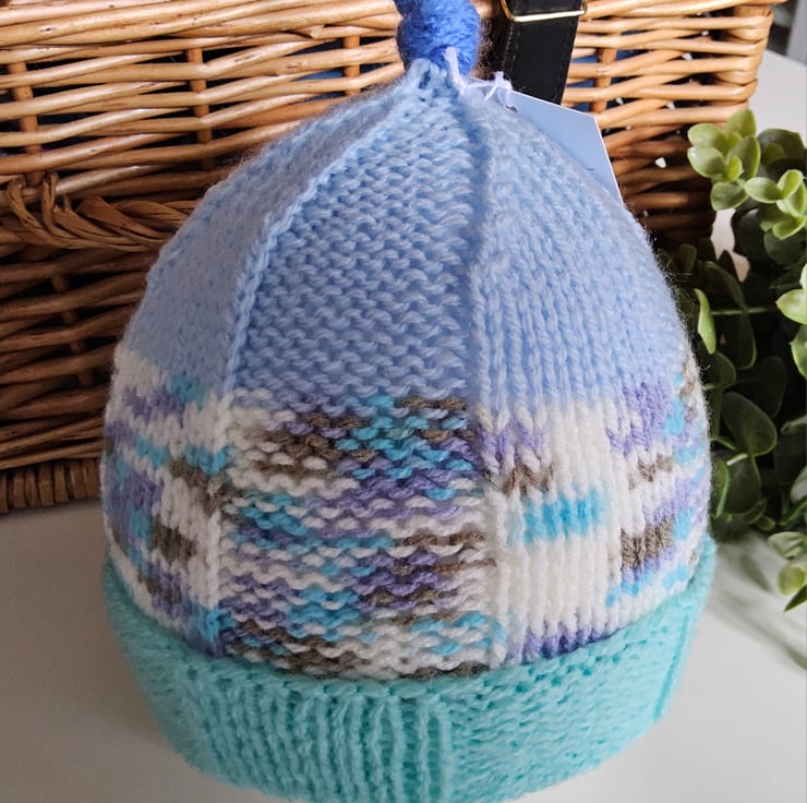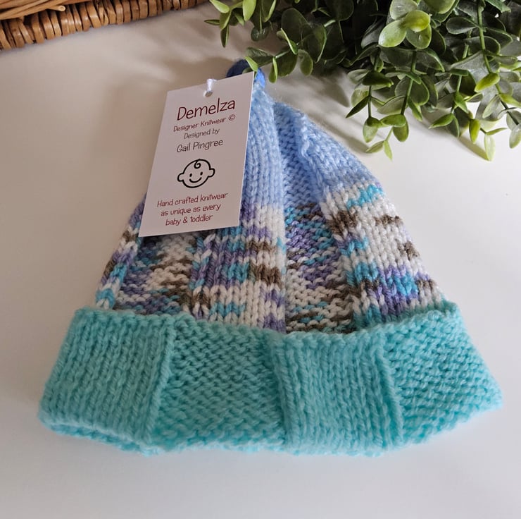 A unique eye catching baby unisex pixie hat designed and hand crafted in Cornwall. Baby's look so cute wearing these little hats whilst out and about during cold days and they are a firm favourite with customers over the years.