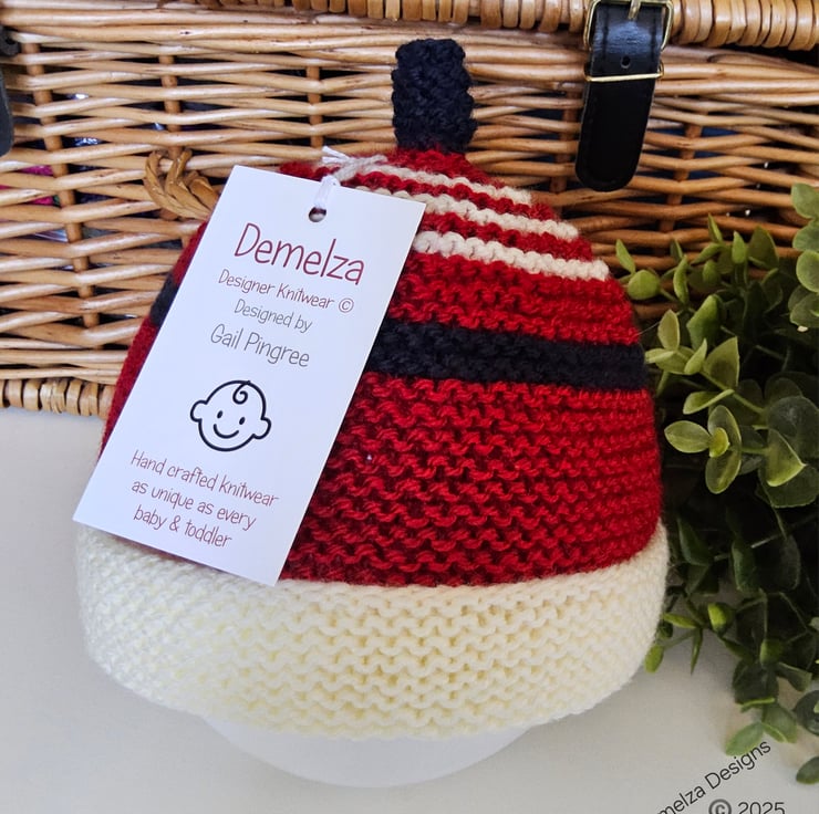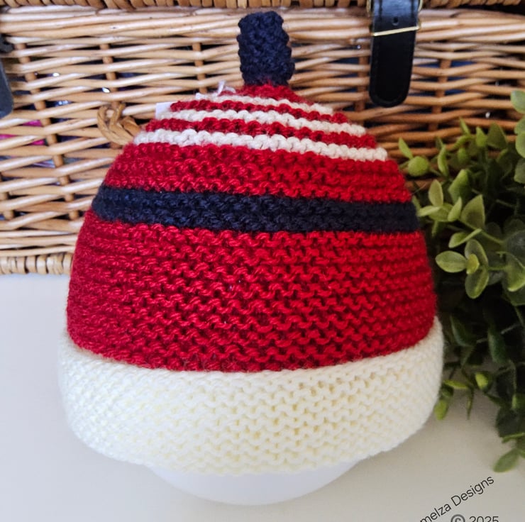 A very practical baby hat designed and lovingly hand crafted in Cornwall using branded British machine washable acrylic yarns.