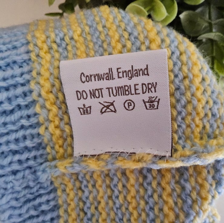 Baby knitwear is designed and hand crafted by Demelza Designs in Cornwall meeting UK baby safety standards, Only branded premuim acylic, acrylic/natural fibre blends or pure natural fibre yarns are used in baby knitwear which conforms to BS984/76 standards.