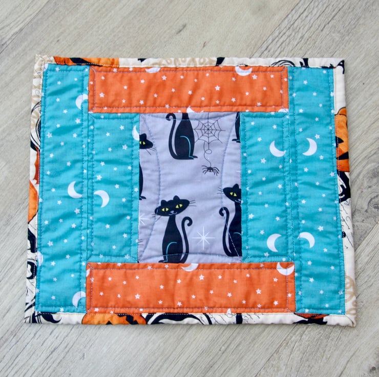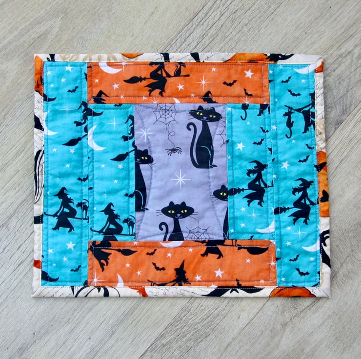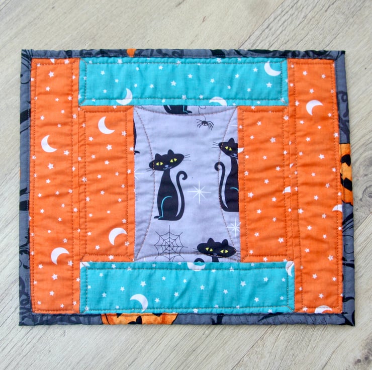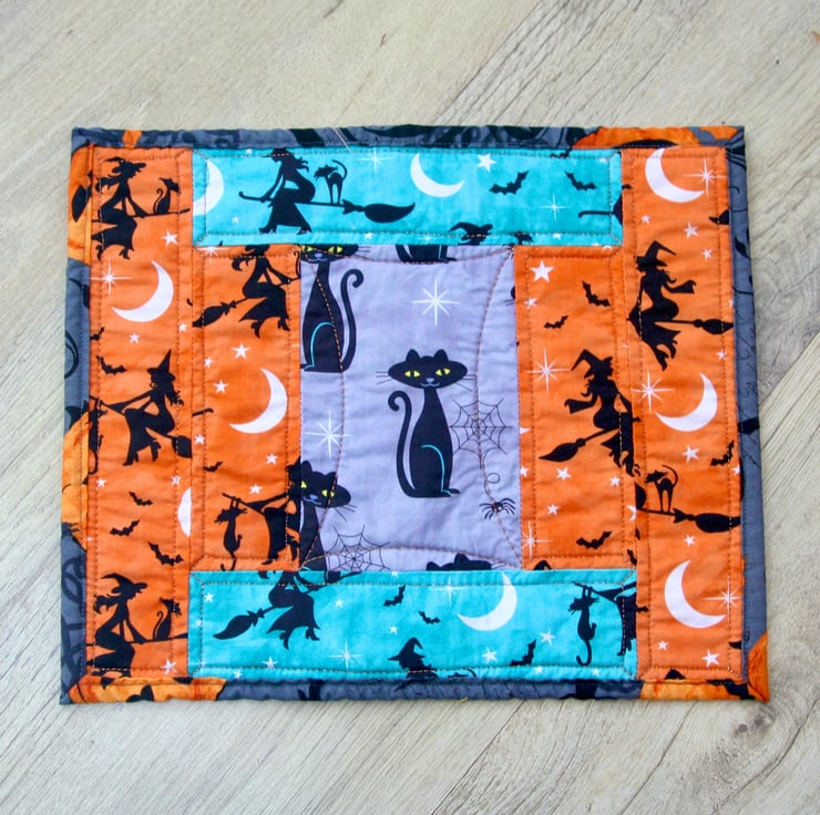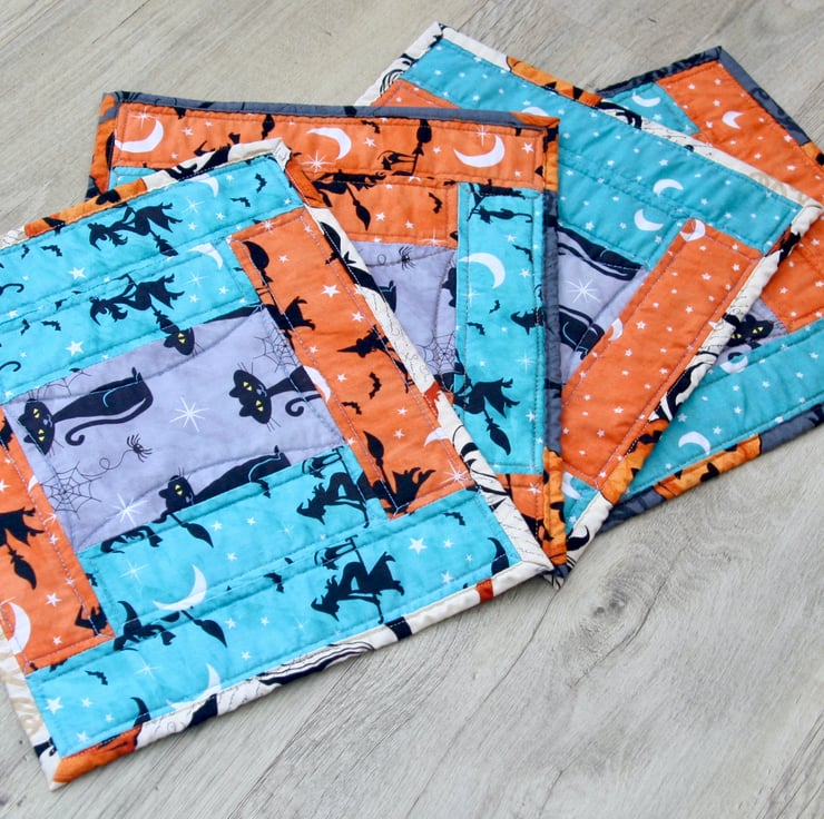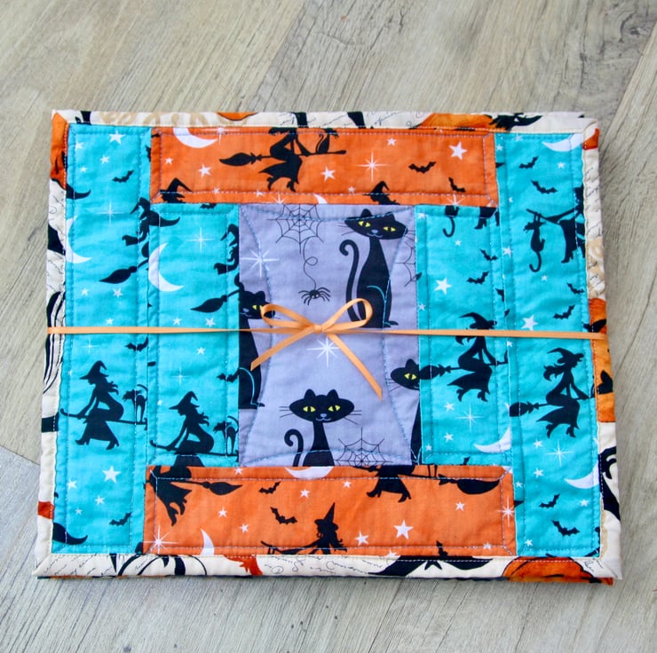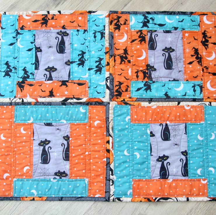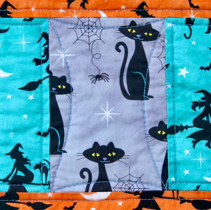 They have a grey centre panel with some cats and spiderwebs, which are surrounded by teal and orange strips with either witches on broomsticks or stars and moons. . The backing is either a cream or grey cotton with pumpkins.