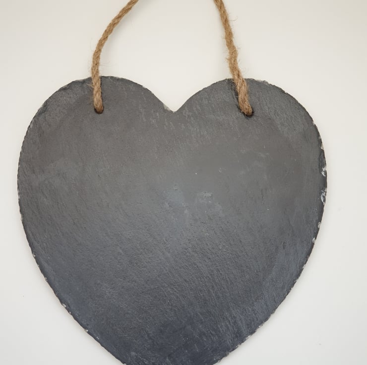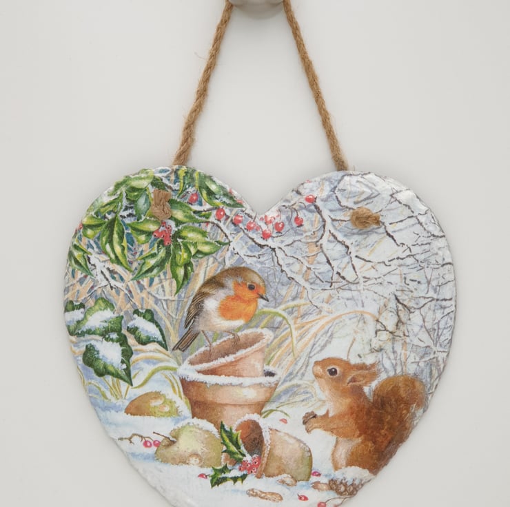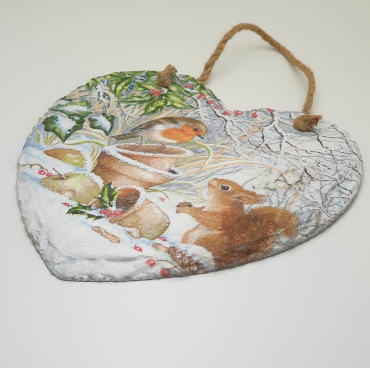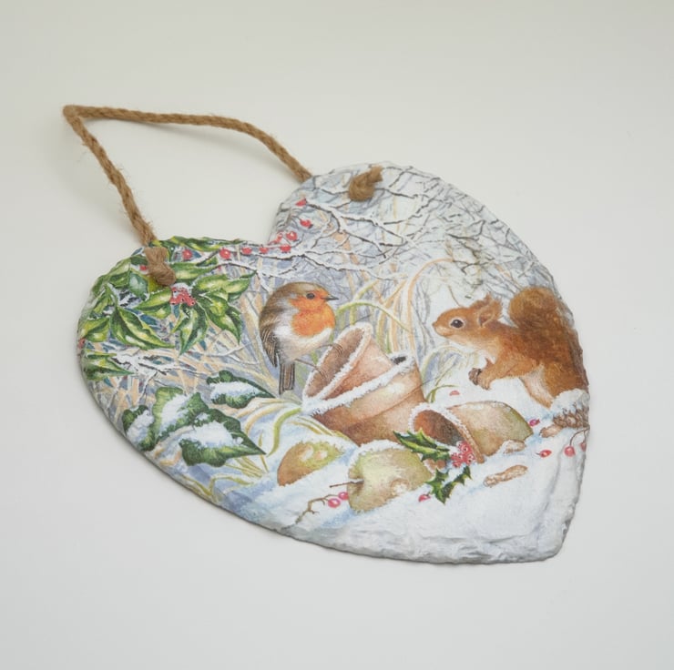 Large slate heart hanging decoration which has been lovingly decoupaged with a robin and squirrel in the snow on the front and the rear has been left as plain slate. For protection the heart has been sealed with interior satin varnish and comes ready to hang with twine. This gorgeous heart would make a lovely gift or make a great addition to your Christmas decor and could be hung in a window, from a handle or mantlepiece, etc.