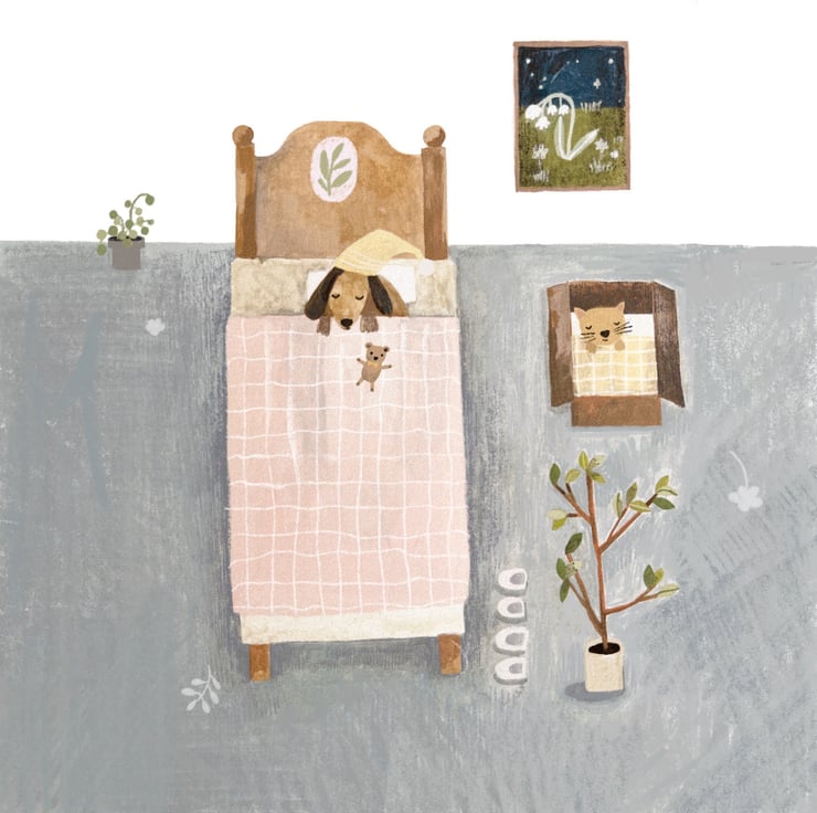 Cute cat and dog going to bed after a long day outdoors.