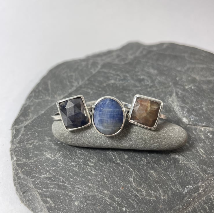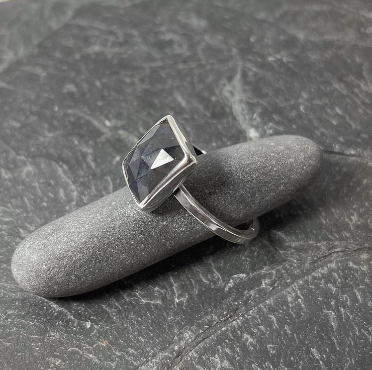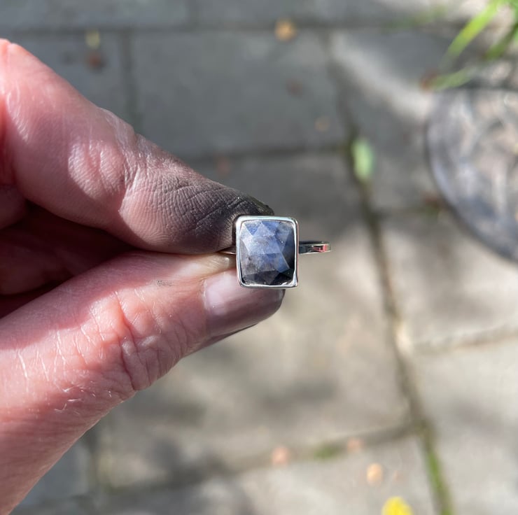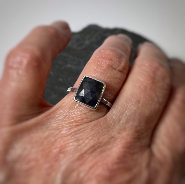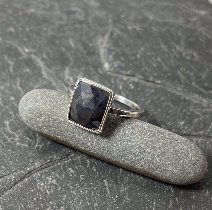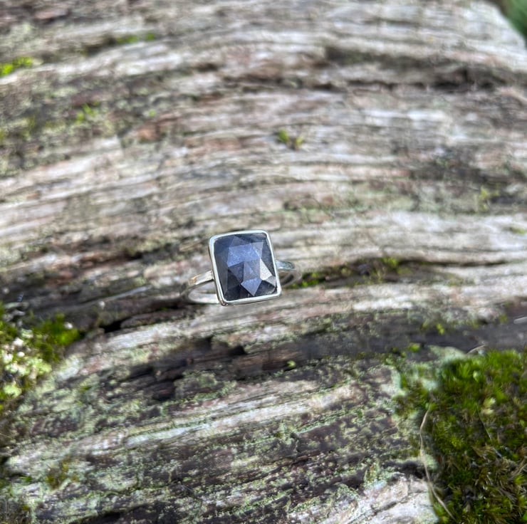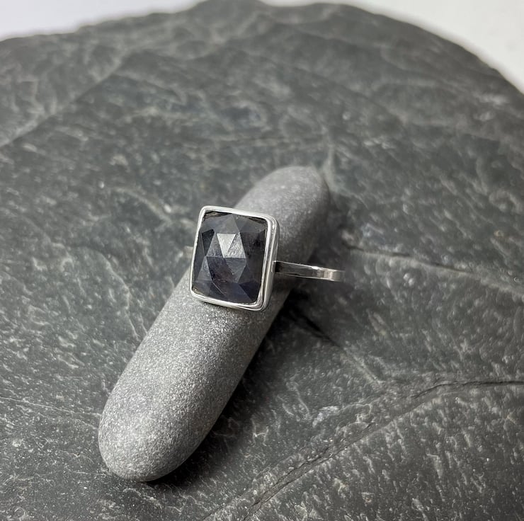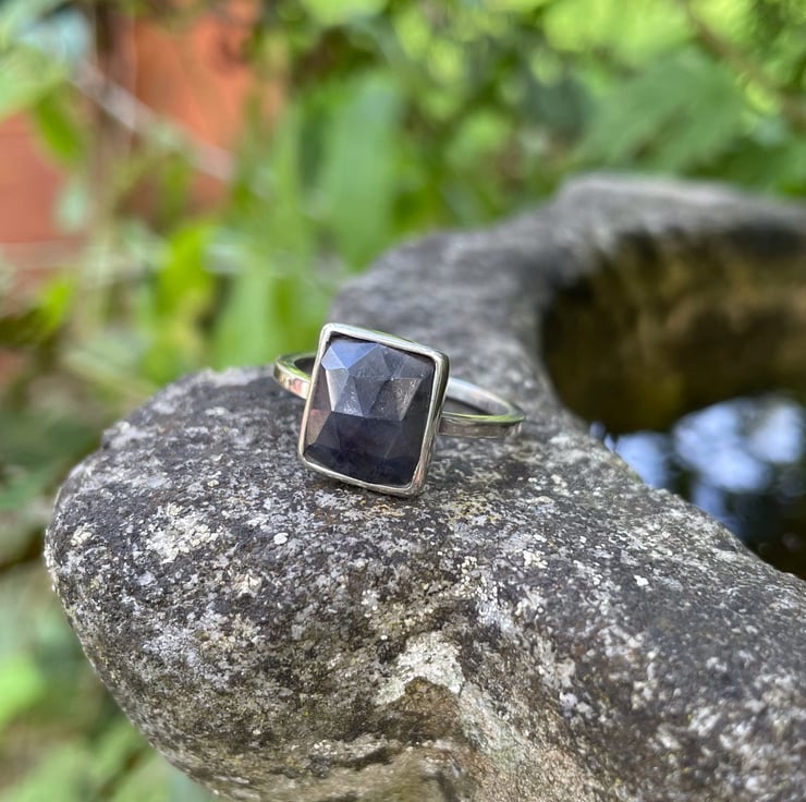 A rectangular rose cut sapphire has been simply set in a thick silver rub over setting. The colour of this stone is a dark charcoal grey with a hint of blue, so difficult to describe. The ring shank is made from square profile wire. U.K. size P