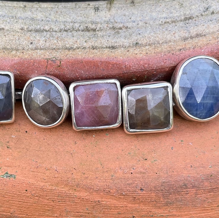 The stone is an opaque dark blue black grey, it looks different colours in different light, look at the photos taken in both natural and under electric light. The large facets catch the light and add a subtle sparkle. The stone with setting measures about 11.5mm x 10mm.