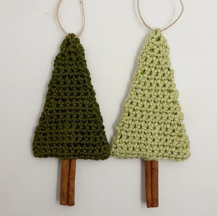 These rustic style fir tree decorations are crocheted in cotton and lined with stiffened felt. They have cinnamon sticks for trunks and a fine jute hanging loop. Each tree measures approximately 12.5 cm tall and comes wrapped in tissue in a labelled PIP ( Postage in Proportion) box, all ready to be given or posted on. There is a tag included in the box, which reads Merry Christmas although I am very happy to exchange this tag for one with wording of your choice. This would would make a novel alternative to a greetings card this year and a lovely tree decoration for many years to come.