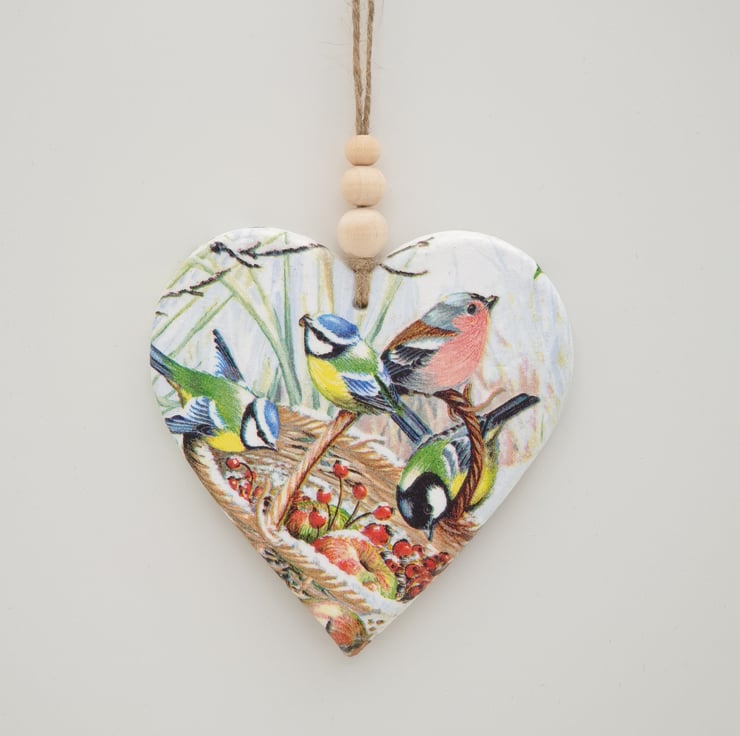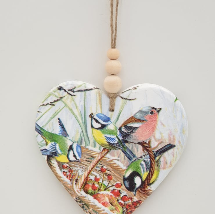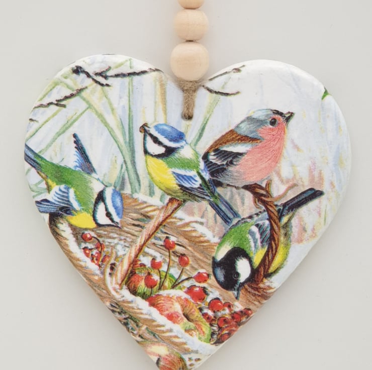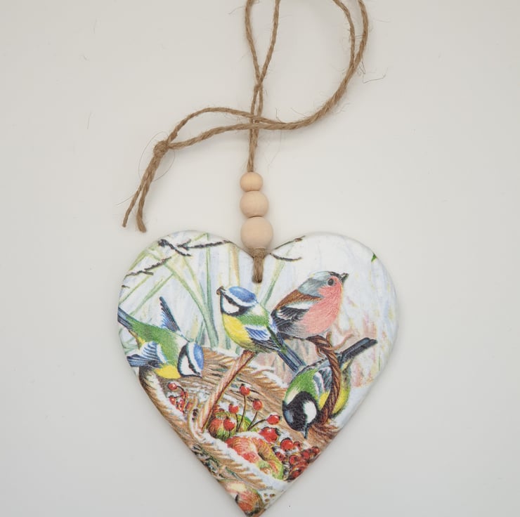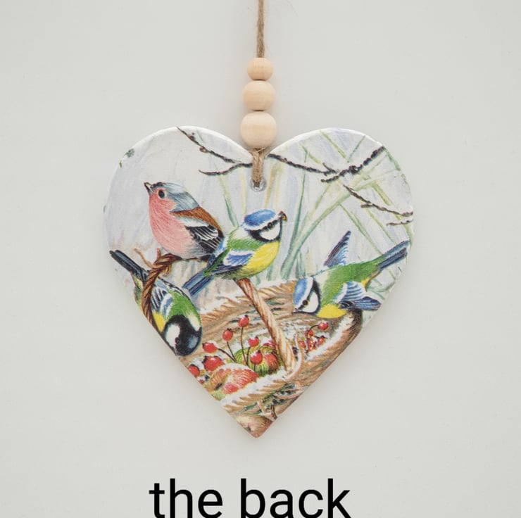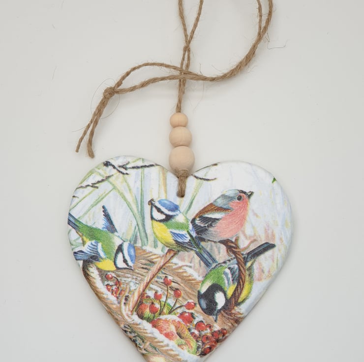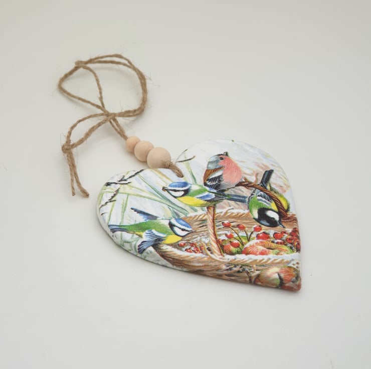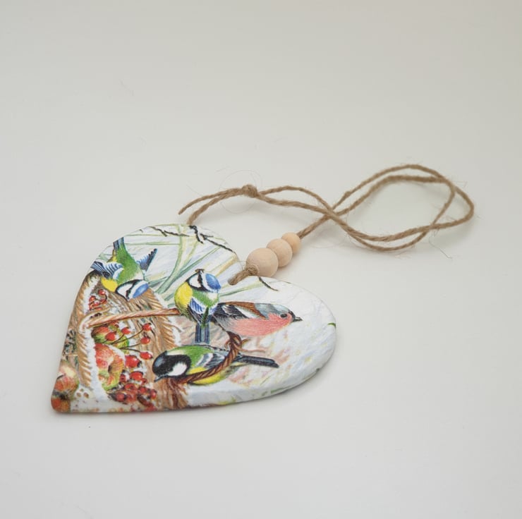 Gorgeous garden bird hanging heart decoration. The heart has been handcrafted from air dry clay and then decoupaged with sweet garden birds on both sides and sealed with varnish and finished with twine and 3 wooden beads ready to hang.