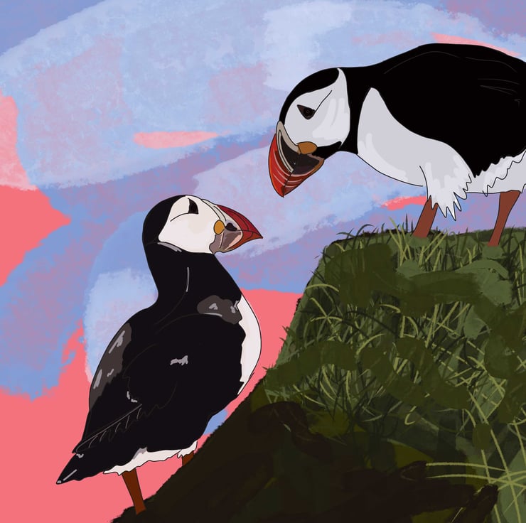 We love puffins! It's a family affair, we all love puffins, so we tend to draw them a lot. They are such funny birds (second to penguins, the other-halfs favourite, of course). They keep us all smiling and I hope these little feathered fools make you smile too.