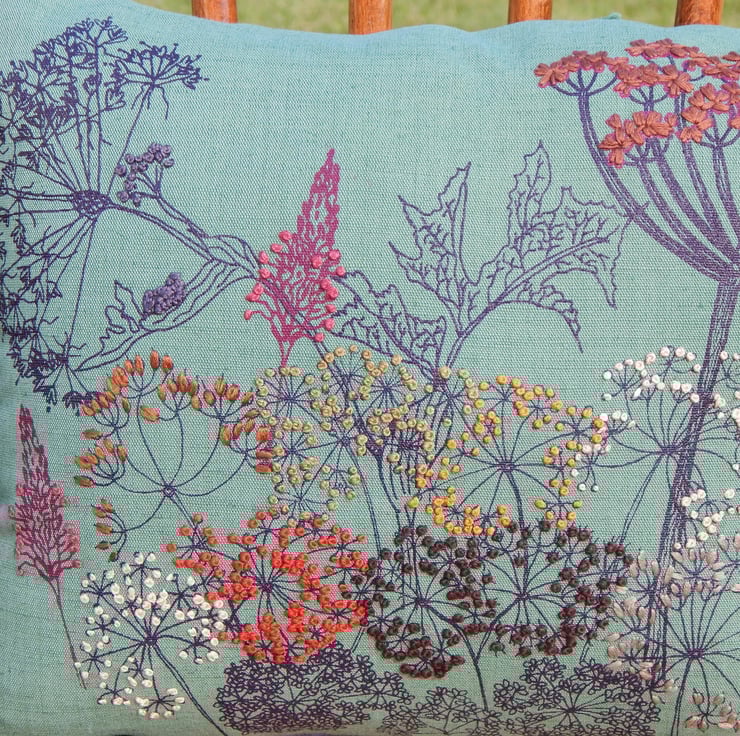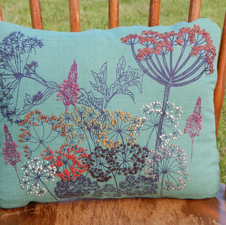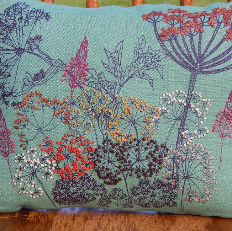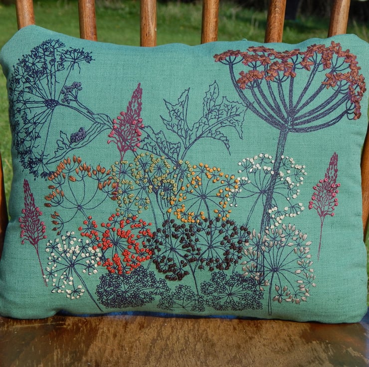 This is a Green heavy weight linen cushion that has been screen printed with my own designs. Many have been individually printed which involves positioning, printing an individual flower, drying and then repeating. This gives you an absolutely one off, designed cushion. There are cow parsley, hogweed and hoary plantain. Many of the flowers are hand embroidered for a pop of texture and colour, all with a hint of crisp Autumnal colours from grey, to dusky pink, yellows to browns.